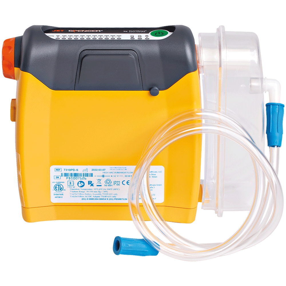 Jet ist ein äußerst kompaktes Absauggerät zum Entfernen von Flüssigkeiten aus den Atemwegen oder dem Atemunterstützungssystem. Das Gerät erzeugt einen Unterdruck, der Flüssigkeiten durch einen Einwegschlauch zieht, der mit dem Sammelbehälter verbunden ist. Größe nur 245 x 70 x 185 mm, Flow 32 L/min, Battery:12V DC Ni-MH.