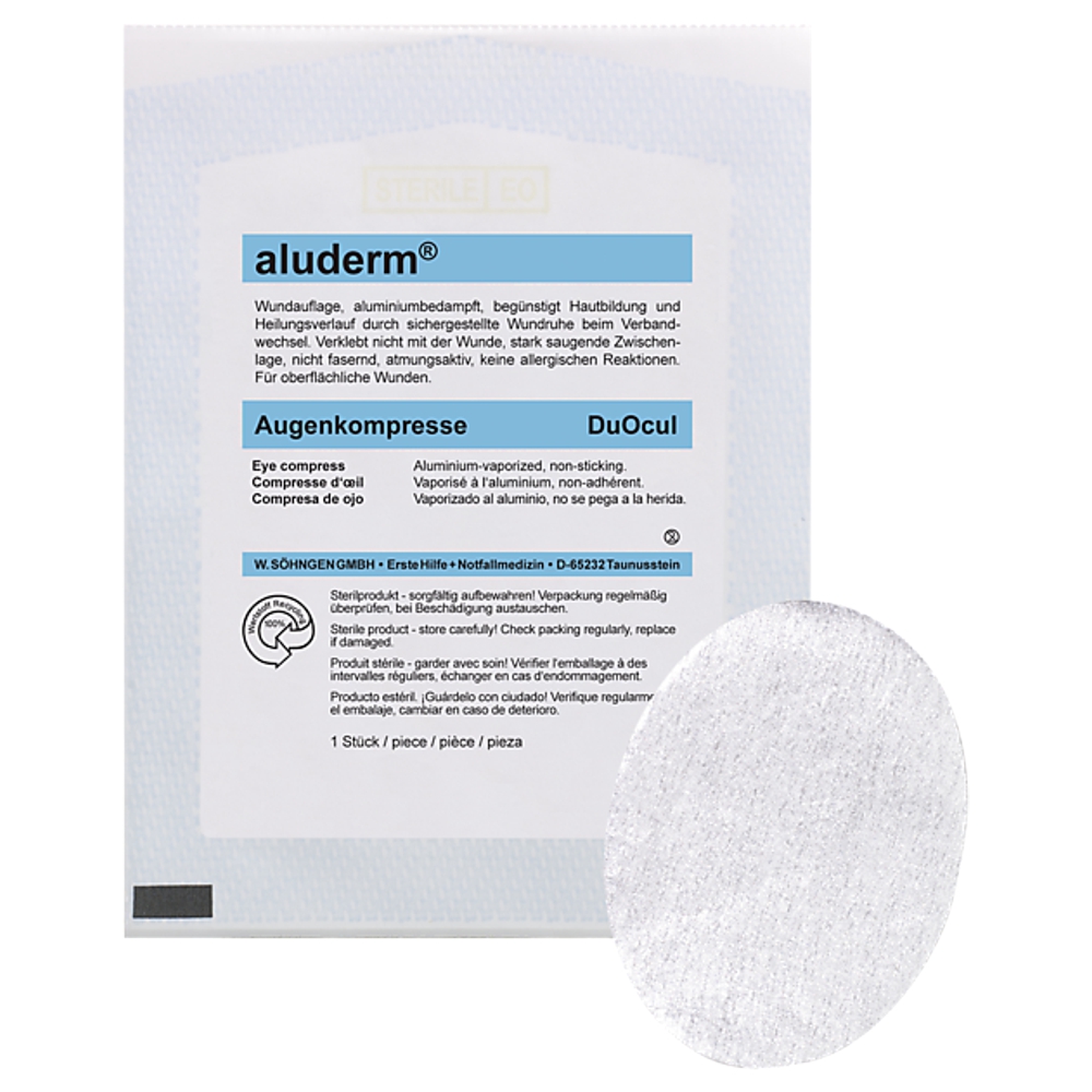 Wundversorgung und Polsterung von Augenverletzungen. Zwei oval geformte Augenkompressen, zusammen steril in Peelpackung, jeweils eine Kompresse aluderm und eine Kompresse DermaCare.aluderm - die sanfte Wundtherapie. aluderm mit aluminiumbedampfter Wundauflage ist ideal geeignet für alle oberflächlichen Wunden und Verletzungen, oberflächliche Brandwunden, Schürfwunden, Riss- und Schnittverletzungen. aluderm ist nicht nur ein Markenname, es ist der Inbegriff für perfekte Wundversorgung. Ob kleine Verletzungen oder größere Oberflächenwunden - aluderm bringt immer Erleichterung. Medizinisches Fachpersonal und Patienten sind von aluderm begeistert. Der Erfolg, den aluderm bei der Anwendung auch in Spezialkliniken hat, bestätigt die Außerordentlichkeit und Qualität dieses Verbandstoffes. aluderm ist ein außerordentlich weicher und geschmeidiger Verbandstoff: aluminiumbedampfte Wundauflage aus Polyestervlies, sehr starke Sauglage (Saugfähigkeit 1.400 g/m2) und hydrophobierte PP-Abschlusslage. aluderm hat viele gute Eigenschaften: aluderm verklebt nicht mit der Wunde, fasert nicht, ist stark saugend, atmungsaktiv, hypoallergen, kann bei der Hautbildung und Heilung helfen, physiologisch unbedenklich, ohne optischen Aufheller und frei von chemischen Bindemitteln.