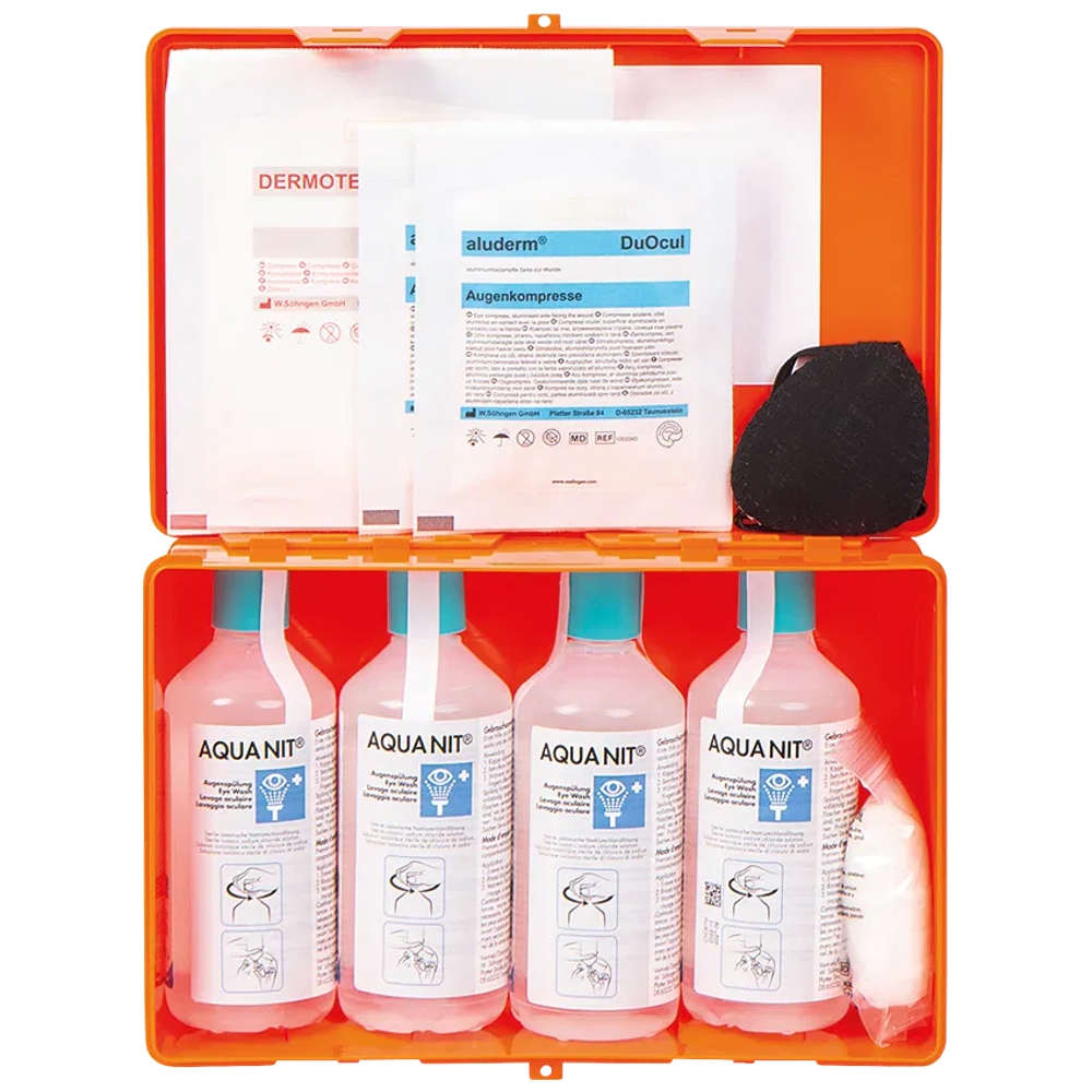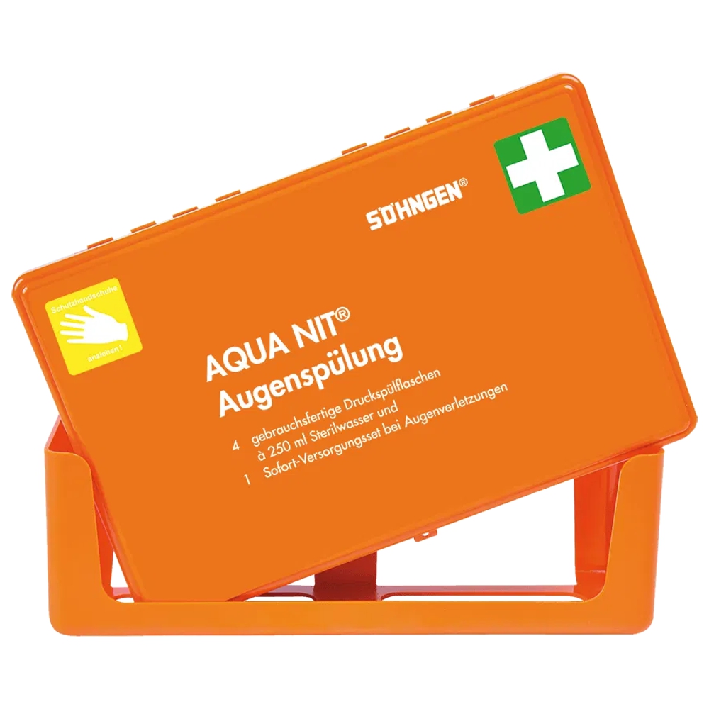 AQUA NIT Augenspülung - SterilwasserGebrauchsfertig, 250 ml Sterilwasser für die sofortige Augenspülung am Unfallort. Für unfallgefährdete Arbeitsplätze in der Werkstatt, im Betrieb, auf Baustellen und im Labor, bei allen Schmutz-, Staub- und Über-Kopf-Arbeiten. Die Box kann an allen unfallgefährdeten Stellen und Arbeitsplätzen bereitgehalten werden. Hat durch die Wandhalterung immer einen festen Platz, kann mit einem Griff schnell und mühelos aus der Halterung entnommen und an den Unfallort gebracht werden. Es ist im Notfall immer reichlich Augenspülflüssigkeit vor Ort verfügbar, nicht benötigte Augenspülflaschen bleiben unversehrt.