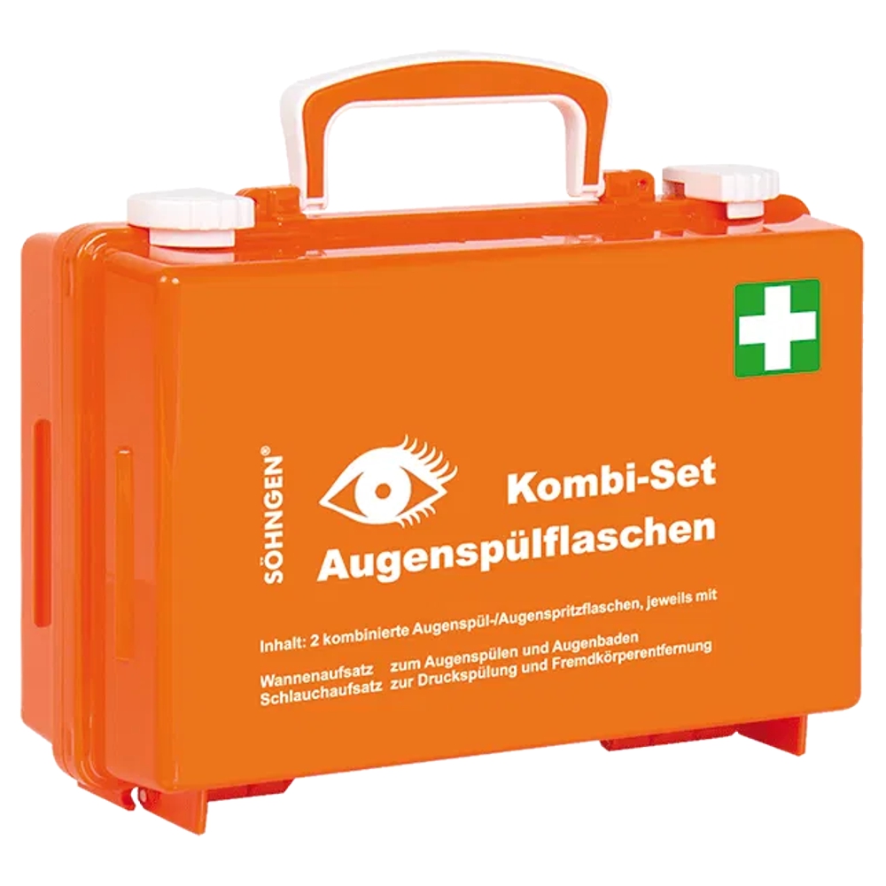Zwei SÖHNGEN Kombi-Augenspülflaschen à 800 ml Fassungsvermögen, lichtgeschützt untergebracht.