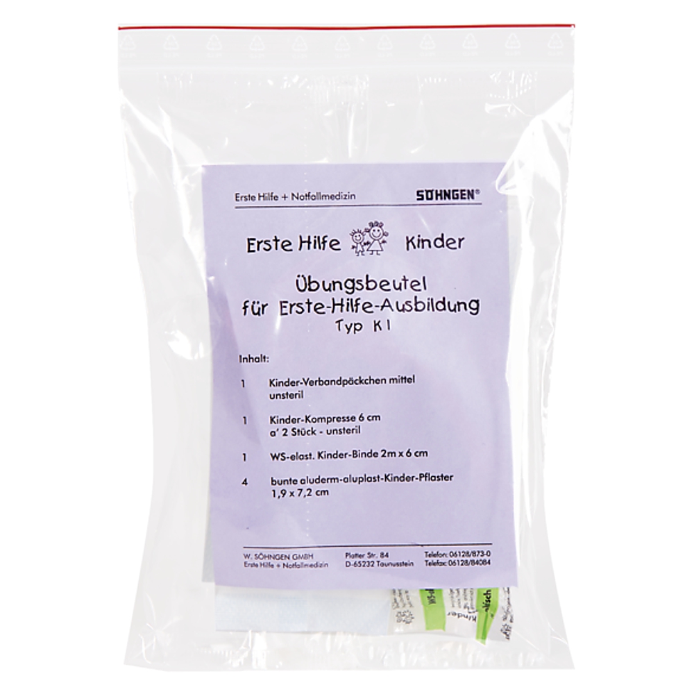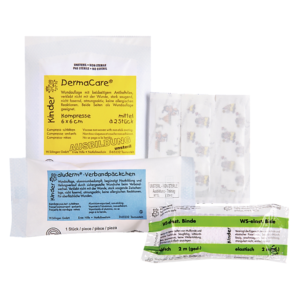 Übungsset KINDER für die Erste-Hilfe-Ausbildung mit Kindern für Kinder. Übungssets "wie für die Großen". Mit kindgerechten Verbandstoffen und kindgerechter, bunter Gestaltung, verpackt in PE-Druckverschlussbeutel. Inhalt: