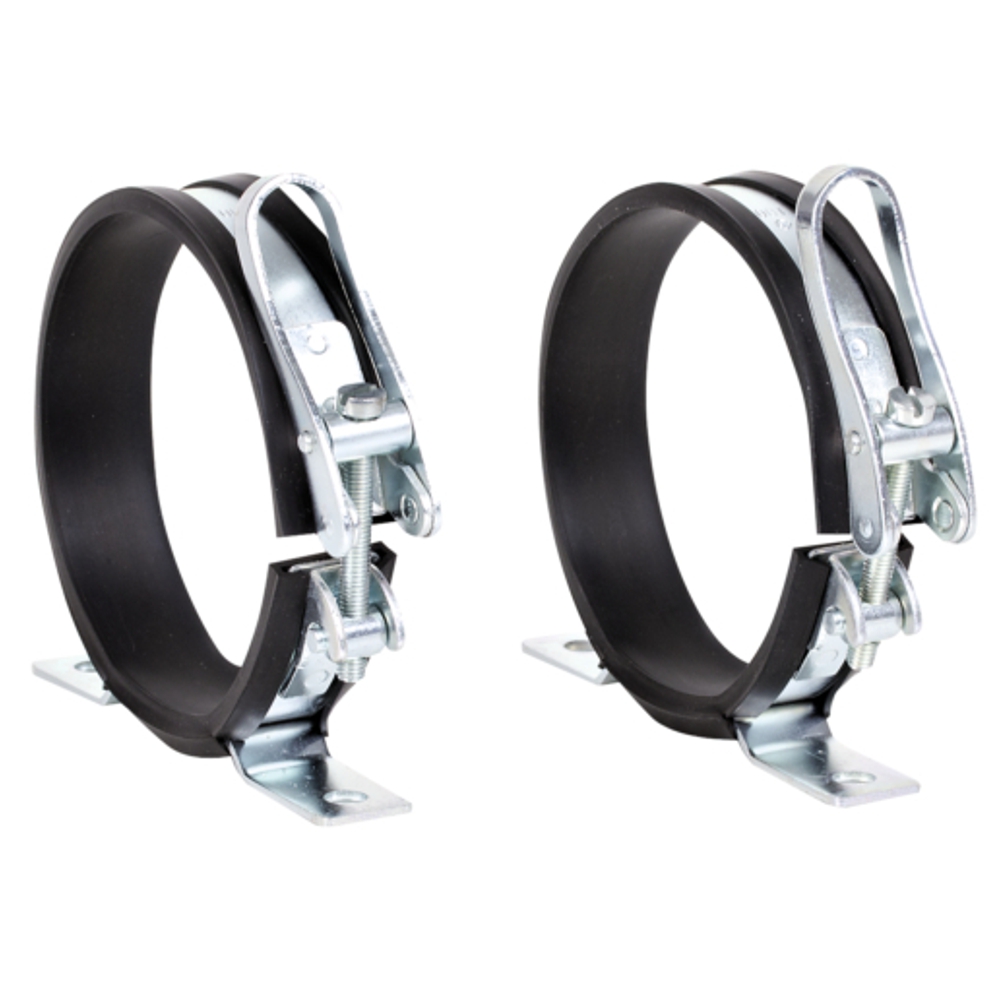 Metallspannringe, jeweils mit innenliegendem Gummipolster, Spannschraube und Befestigungsbohrungen. Zum Sichern und Halten einer Gasflasche ist jeweils ein Paar Spannschellen erforderlich.