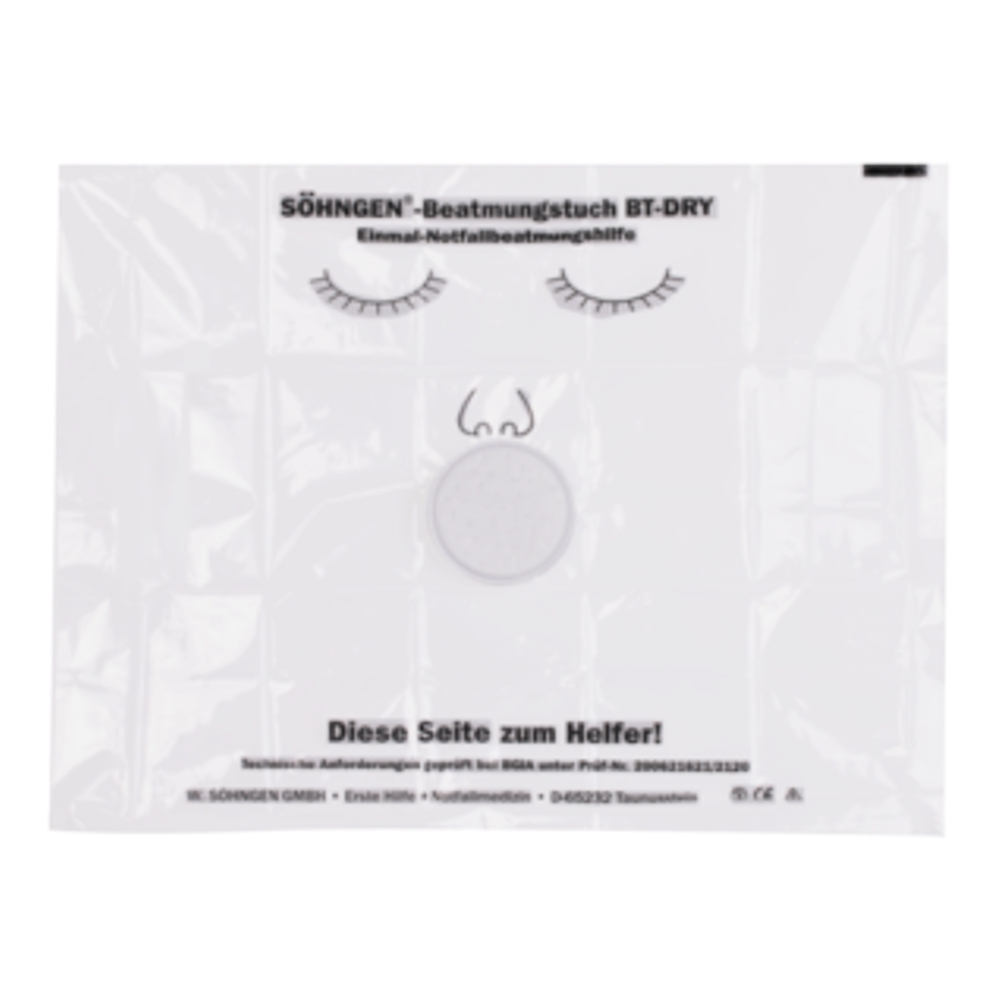 Diese universelle Beatmungshilfe reduziert das Kontaminationsrisiko und hilft die Hemmschwelle bei der Atemspende zu überwinden. Passt noch in jede Geldbörse und bietet guten Schutz für Helfer und Patient. Es ist durch die großzügige Auflagefläche für die Beatmung von Mund-zu-Mund und Mund-zu-Nase gleichermaßen geeignet.Der hydrophobe Beatmungsfilter BT-DRY ist feinporig und besitzt beidseitig feuchtigkeitsabweisende Eigenschaften. Zur leichteren Unterscheidung ist die Folie auf der Anwenderseite bedruckt, vorgestanzte Ohrbügel zur Besfestigung am Patienten verhindern ein Verrutschen.