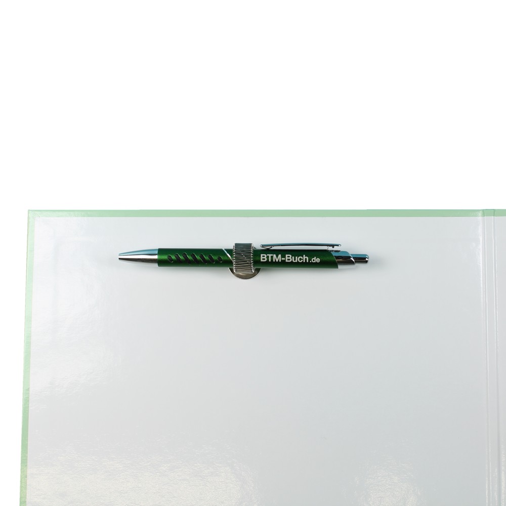 Qualitäts-Ringbuch / Ordner für bis zu 100 BTM Karteikarten, mit Rückenschild, Kugelschreiberhalter aus Metall und mit BTM-Buch.de Metall-Kugelschreiber, Sonderformat mit Höhe 31,5 cm, Länge 26 cm, Breite 4,7 cm, mit 4-Ring-Mechanik. Ausführung: mit Griffloch, Kantenschutz, Blattniederhaltern und Tasche für auswechselbares Rückenschild.