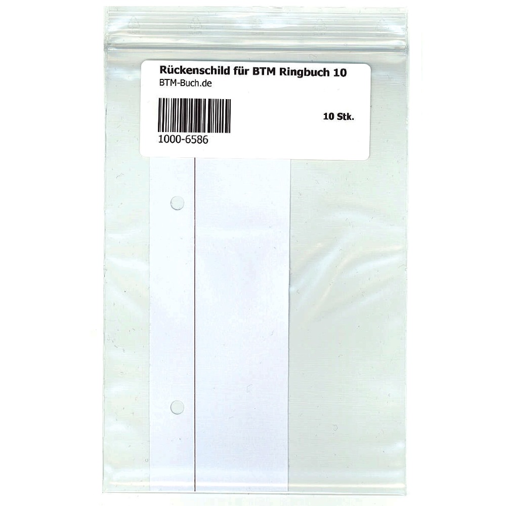 Rückenschild für Ringbuch für BTM Betäubungsmittel Karteikarten, Set zu 10 Stück, mit seitlichem Abheftstreifen perforiert zum abtrennen, ca. 14.6 x 3.6 cm, 100 g/m².