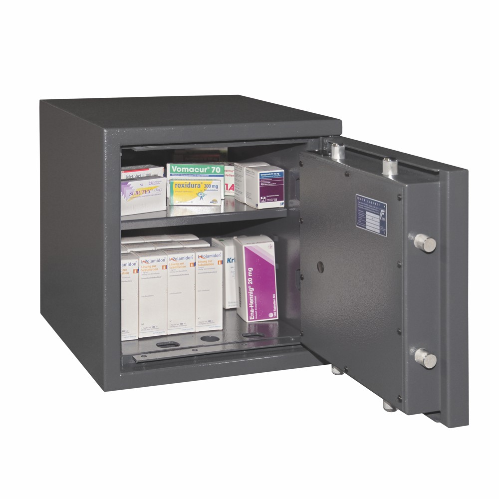 Wertschutzschrank "Made in Germany" nach EN 1143-1 Widerstandsgrad 0. Perfekt als Möbeleinsatztresor verwendbar durch spezielle Maße und geringes Gewicht. Unser BTM Buch DIN A4 kann eingelegt werden. Die Klassifizierung entspricht den Anforderungen nach § 15 des BtmG, für z.B. Apotheken, Altenheime und Teilbereiche von Kliniken. Serienmäßig mit Doppelbart-Hochsicherheitsschloss mit 2 Schlüssel (120 mm lang). Tür 3-wandig mit 3-seitiger Verriegelung durch Schließbolzen (Ø 20 mm) und starre Hintergreifprofile an der Bandseite. Türöffnungswinkel 180° durch speziell im Rahmen liegende Türbänder. Allseitig dreiwandiger Korpus. Serienmäßig ausgestattet mit 1 Bohrung hinter dem Türrahmen im Boden und 1 Bohrung in der Rückwand (mittig), inkl. Verankerungsmaterial. Farbe: RAL 7024 (graphitgrau). Maße Format Lyra 2: Innenmaße H 325 x B 311 x T 305 mm, Außenmaße H 405 x B 400 x T 420 mm.