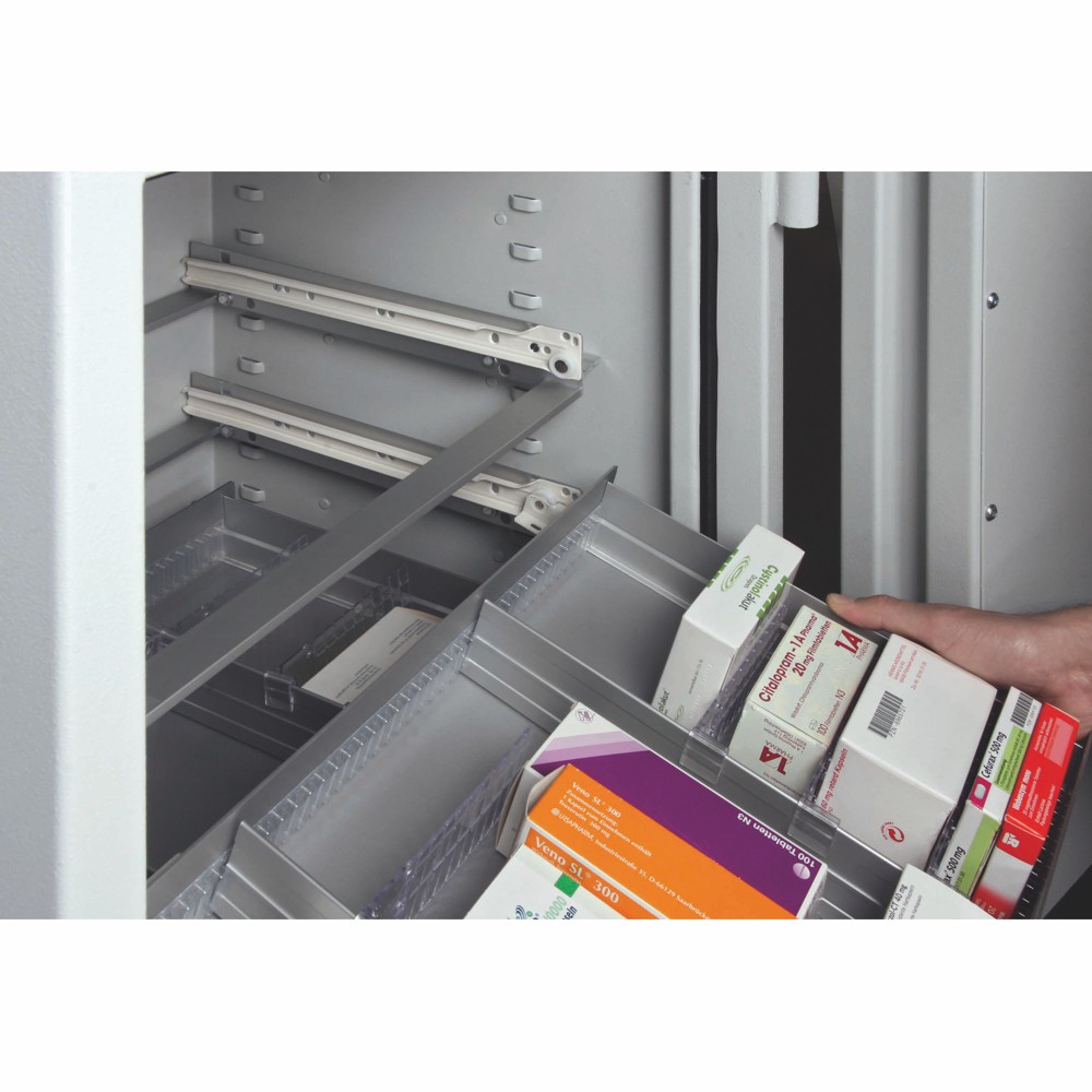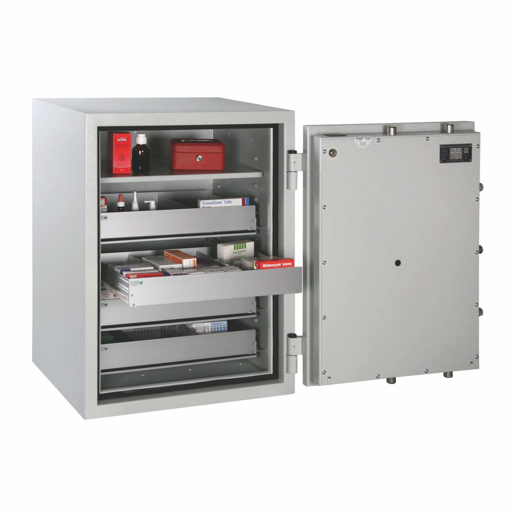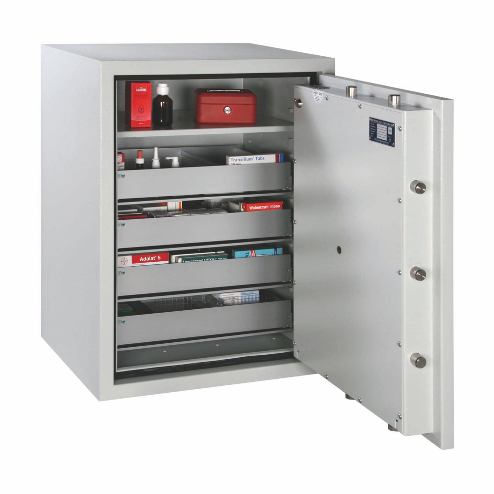 BTM Tresor für Apotheken, Krankenhäuser oder Altenheime als Zentraltresor, wenn die BtM nicht in Teilbereichen dezentral gelagert werden. Basis für diese speziellen Betäubungsmittleltresore sind Wertschutzschränke der Klassse I nach EN 1143-1. Diese erfüllen die Anforderungen und Auflagen nach §15 des Betäubungsmittelgesetzes (BtMG). Die Einrichtung mit 4 hochflexiblen Schubladen ermöglicht eine bessere übersichtliche Ordnung der Medikamente und Opitat. Die Schubladenelemente können individuell eingerichtet werden und auch in der Höhe anpepaßt werden. Einzelne Elemente können zudem jederzeit nachgekauft werden. Ein Innentresor kann nachträglich integriert werden. Serienmäßig mit Doppelbart - Sicherheitsschloss mit 2 Schlüsseln, 120 mm lang. Sichere 3-seitige Verriegelung durch massive Schließbolzen (Ø 25 mm dick) und starre Hintergreifprofile. Türöffnungswinkel 180° durch außenliegende Türbänder. Fester Stand durch serienmäßige Vorrichtung zur Bodenverankerung, inkl. zugelassenem Verankerungsmaterial. Farbe: RAL 7035 (lichtgrau), auch optional in RAL 7024 (graphitgrau) erhältlich. Außenmaß 800 x 600 x 500, Innenmaß 735 x 528 x 365, Gewicht 239 kg, 1 Fachboden und 4 Schubladen.