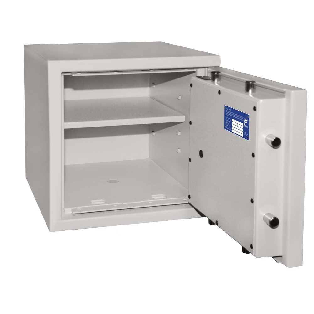 Wertschutzschrank "Made in Germany" nach EN 1143-1 Widerstandsgrad 1. Perfekt als Möbeleinsatztresor verwendbar durch spezielle Maße und geringes Gewicht. Unser BTM Buch DIN A4 kann eingelegt werden. Die Klassifizierung entspricht den Anforderungen nach § 15 des BtmG, für z.B. Apotheken, Altenheime und Kliniken. Serienmäßig mit Doppelbart-Hochsicherheitsschloss mit 2 Schlüssel (120 mm lang). Tür 3-wandig mit 3-seitiger Verriegelung durch Schließbolzen (Ø 20 mm) und starre Hintergreifprofile an der Bandseite. Türöffnungswinkel 180° durch speziell im Rahmen liegende Türbänder. Allseitig dreiwandiger Korpus. Serienmäßig ausgestattet mit 1 Bohrung hinter dem Türrahmen im Boden und 1 Bohrung in der Rückwand (mittig), inkl. Verankerungsmaterial. Farbe: RAL 7035 (lichtgrau). Maße Format Lyra 2: Innenmaße H 325 x B 311 x T 305 mm, Außenmaße H 405 x B 400 x T 420 mm.