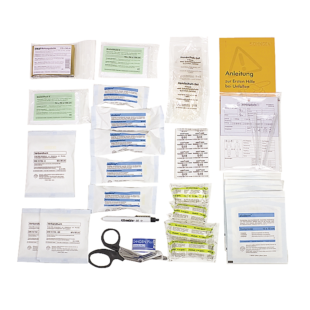 Hochwertige Verbandstoffe, Füllung nach DIN 13160. Mit Diagnostikleuchte und Anhängekarten.