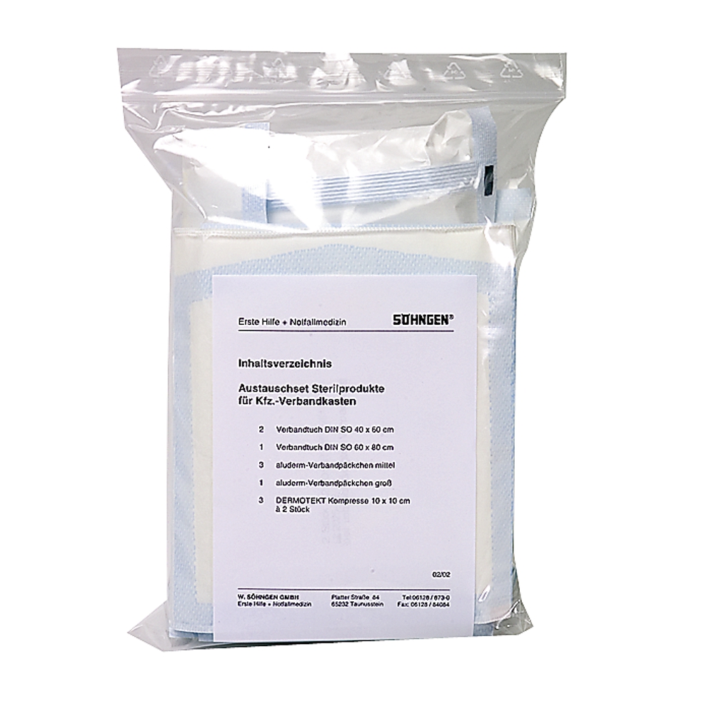 Austauschset Sterile Verbandstoffe. Bei Erste-Hilfe-Ausstattungen, deren Inhaltsteile mit Verfalldatum gekennzeichnet sind, verlangt der Gesetzgeber, dass nach Ablauf der Verfalldaten ein Austausch der Sterilprodukte erfolgen muss.