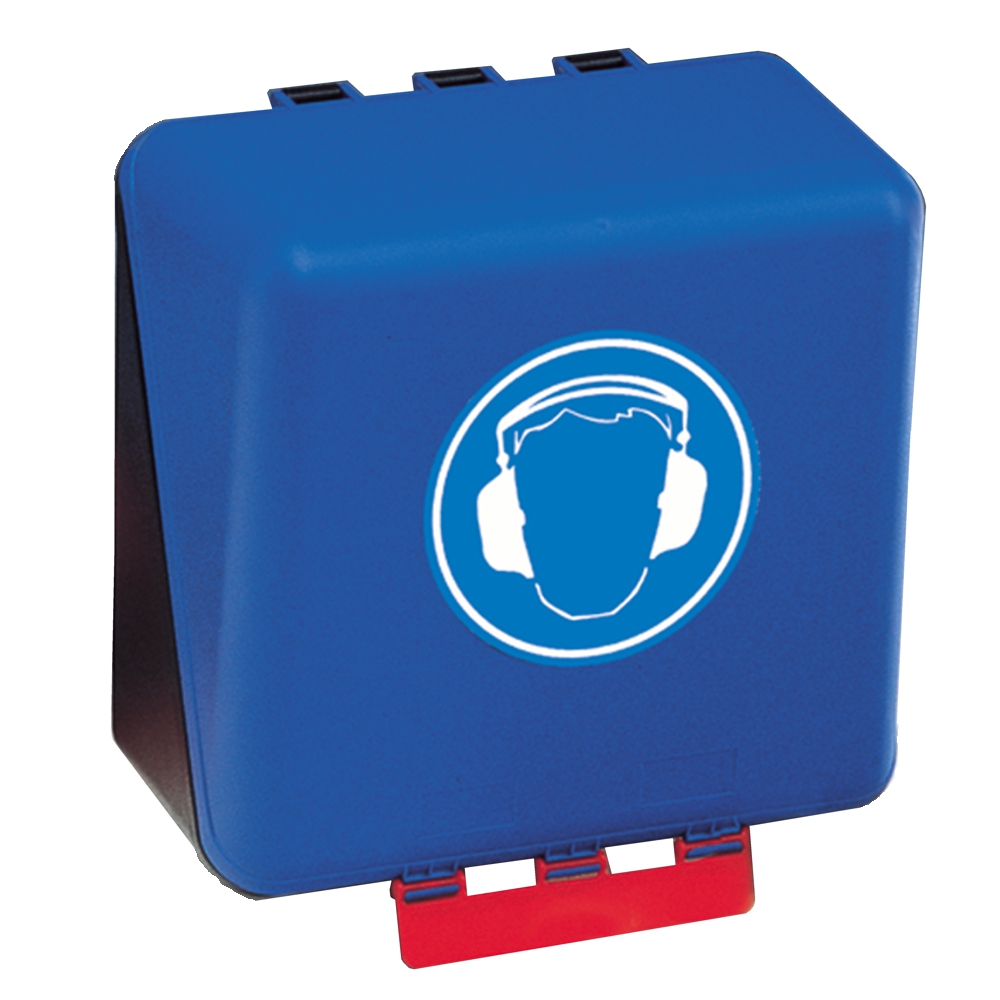 Aufbewahrungsbox für Gehörschutz, staub- und spritzwasserdichte Box zum Aufbewahren des Gehörschutzes, einfache Befestigung durch Aufkleben oder Anschrauben.