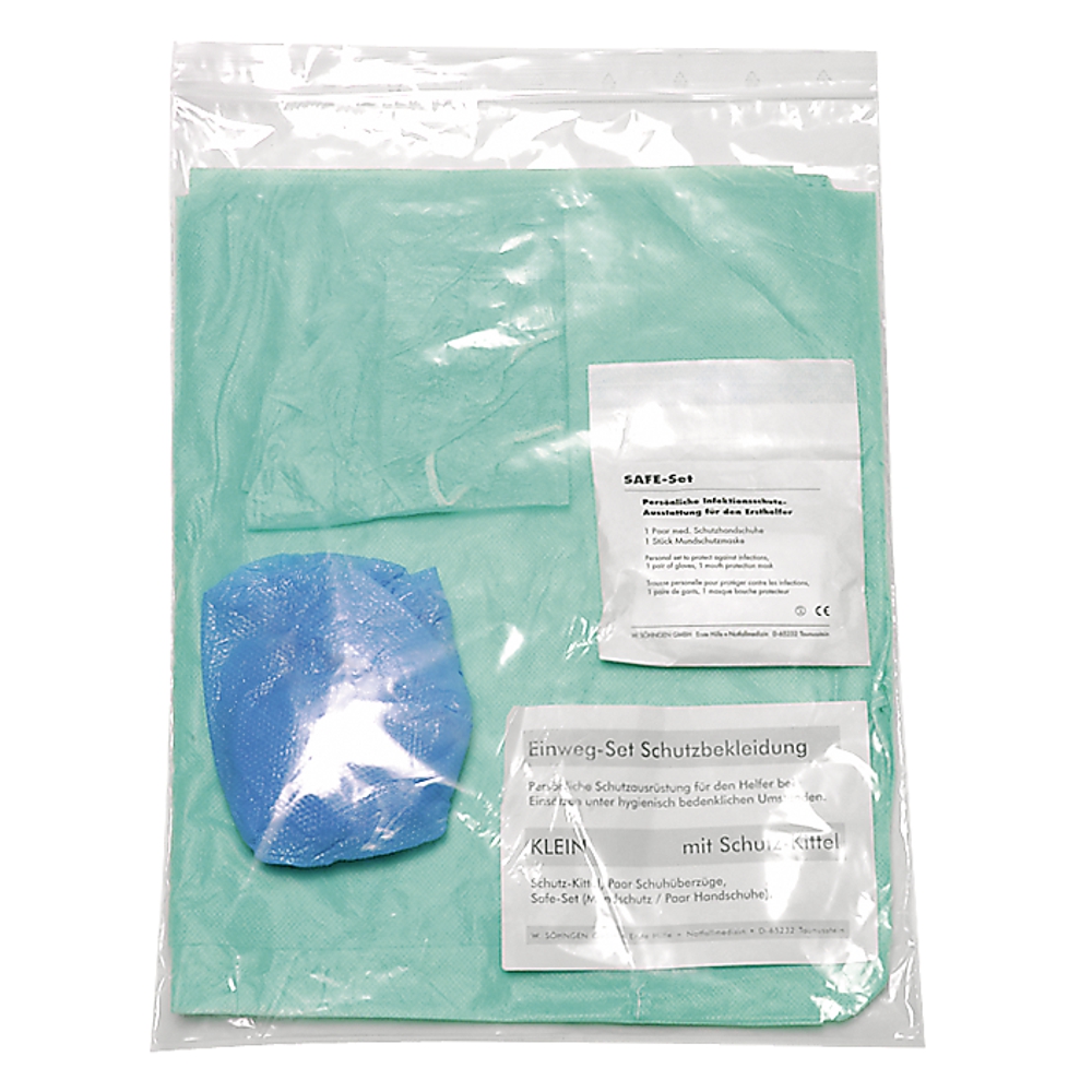 Einweg-Set Schutzbekleidung. Stets griffbereite, persönliche Schutzbekleidungssets für den Helfer bei Einsätzen unter hygienisch bedenklichen Bedingungen. Mit Schutzkittel. Jeweils mit Safe-Set, Kopfhaube, Schuhüberzügen und Entsorgungsbeutel.