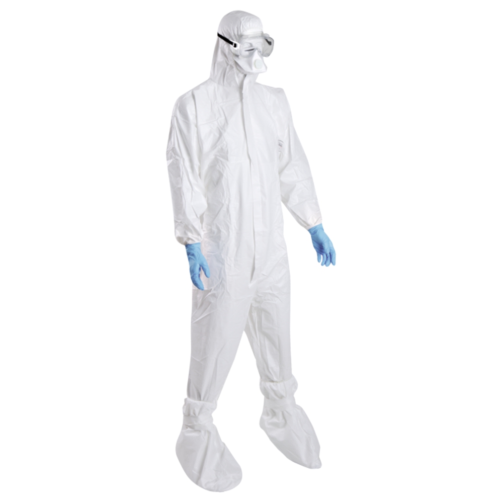 - 1 Schutzoverall nach EN 14126, Kat. III, Typ 5+6, antistatisch, Gummizug an Taille, Handgelenk und Fußknöchel, Kapuze, Reißverschluss-Abdeckung