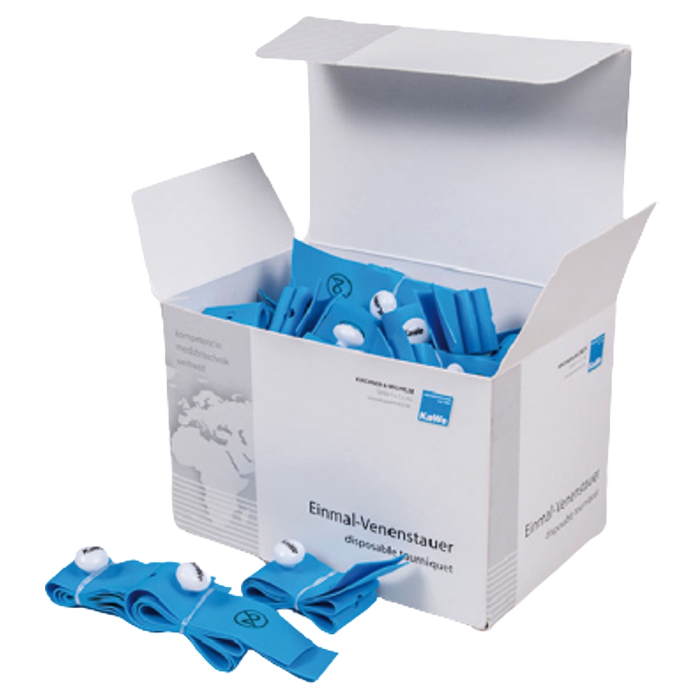 Hygienisches Einmalprodukt, zur Vermeidung von Kreuzkontaminationen. Praktische Lochung mit Knopf für alle Oberarmgrößen kompatibel - vom Säugling bis zur Übergröße. Praktische Lochung mit Knopf, Biokompatibel, Latexfrei, Länge ca. 42 cm, Dehnbar, Verpackungseinheit zu 50 Stück.