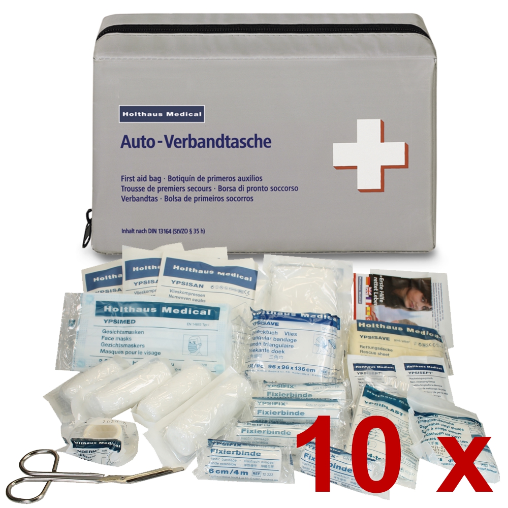 10 KFZ Klassik Verbandtasche HOLTHAUS Verbandkasten mit Füllung nach DIN 13 164 grau
