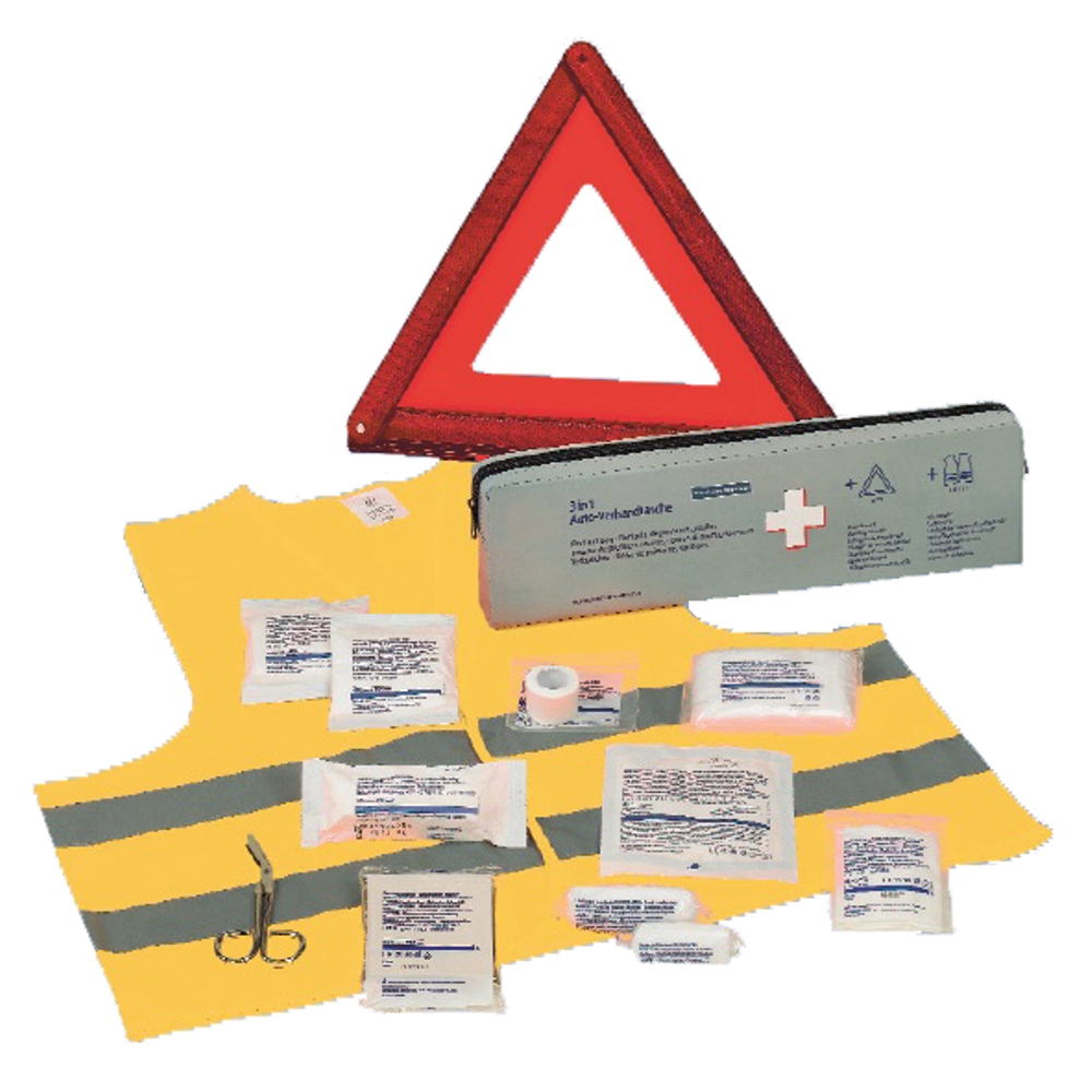 KFZ Klassik 3 in 1 Verbandtasche HOLTHAUS KFZ Verbandkasten mit Füllung nach DIN 13 164 grau + Warndreieck + Warnweste