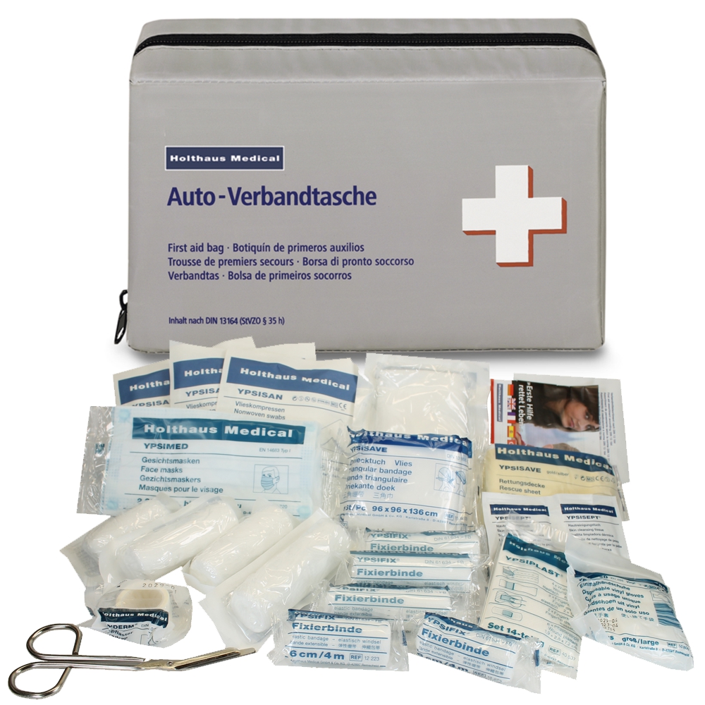 Verbandtasche nach neuer Norm 2022 mit 2 Gesichtsmasken, aus Nylon mit umlaufendem Reißverschluss und Außenschutzfolie. Inhalt nach DIN 13 164. 23 x 14 x 8 cm, grau.
