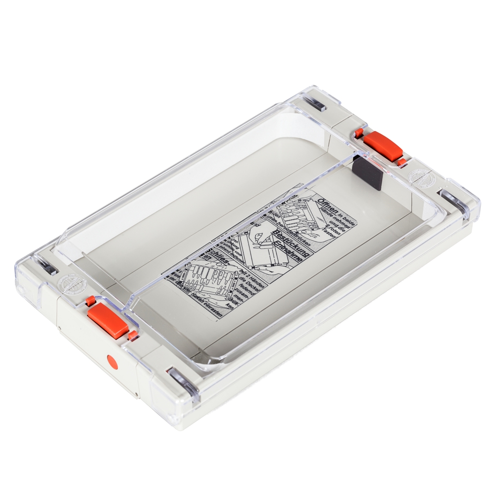 Ampullenspender - Sicher verpackt, auch unterwegs. Pfiffige Idee. L 20 cm x B 12 cm x H 2,9 cm. ABS-Kunststoff und glasklares Polycarbonat. Lieferumfang Spender ohne Inhalt.