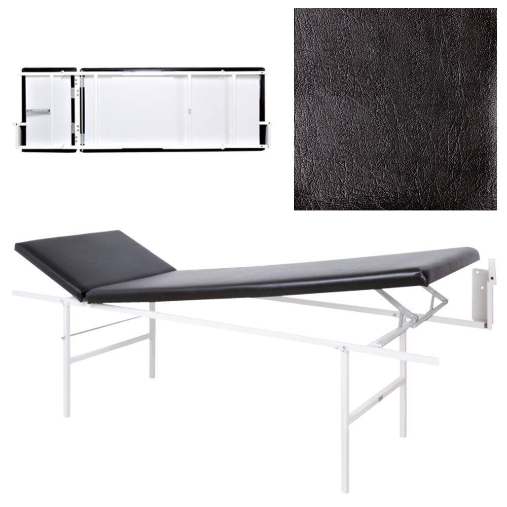 Wandklappliegen. Eine sehr platzsparende Lösung und auch in kleineren Räumen hervorragend einsetzbar. Durch den unkomplizierten Klapp- und Haltemechanismus wird die Liege auf geringem Raum flach an der Wand bereitgehalten und ist mit wenigen Handgriffen einsatzfähig. Die Klapphalterung kann wahlweise an der rechten oder der linken Seite der Liege angebracht werden und ist entsprechend der Liegenhöhe mit der Wand zu verschrauben. Untersuchungsliege - Wandklappmodell waagerecht. In Erste-Hilfe-Räumen in Betrieben sind gemäß ASR A4.3 Untersuchungs- und Massageliegen bereitzuhalten.