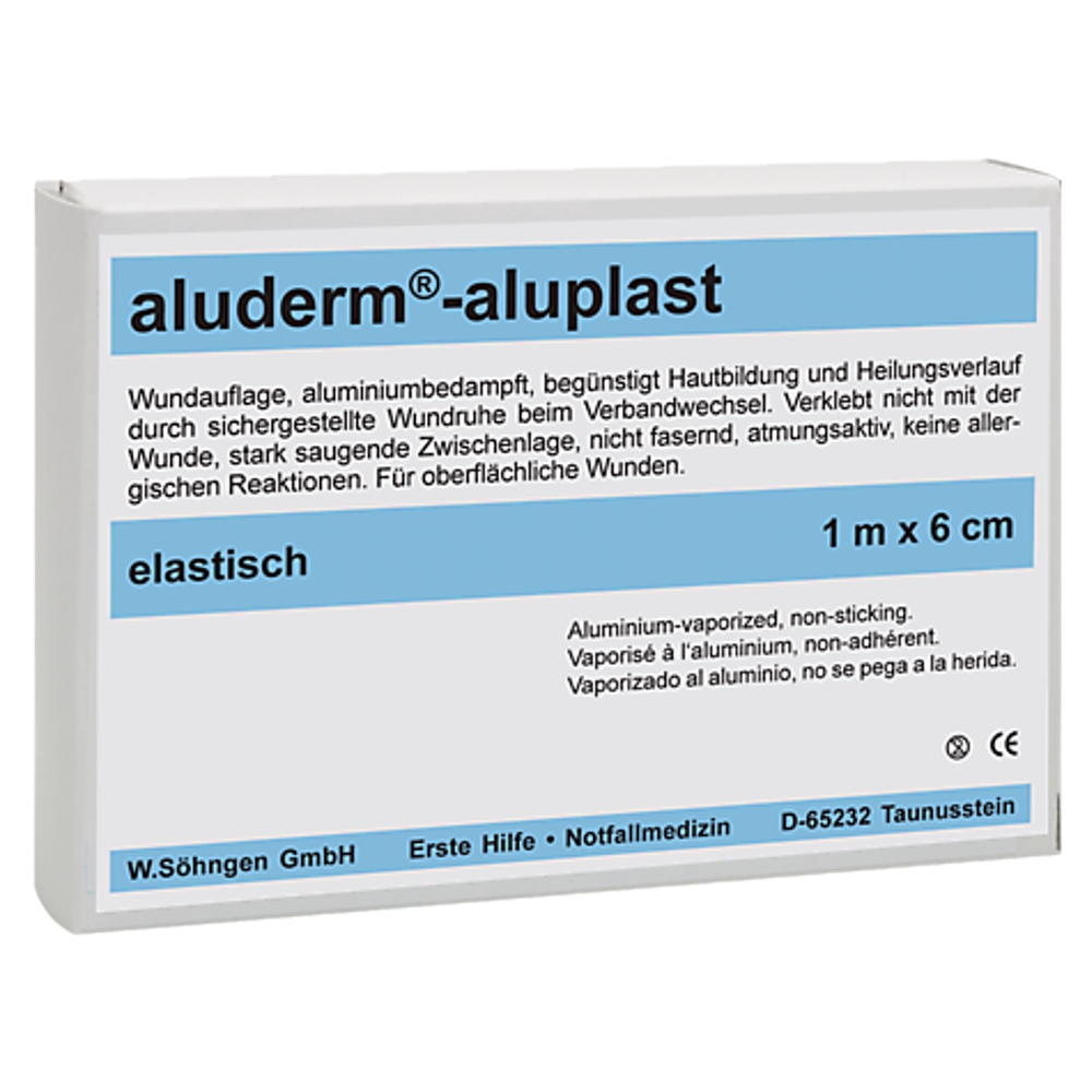 aluderm-aluplast Wundverbandpflaster in Abschnitten. Pflaster in 10 cm-Abschnitten, jeweils einzeln eingesiegelt.aluderm-aluplast Wundverbandpflaster. aluderm-aluplast ist das besondere Wundverbandpflaster mit aluminiumbedampfter aluderm Wundauflage und Saugvlies. aluderm verklebt nicht mit der Wunde, fasert nicht, ist stark saugend, kann bei der Hautbildung und Heilung helfen, ist atmungsaktiv. aluderm-aluplast elastisch: Trägermaterial hochelastisches Polyestervlies, weiß, besonders hautfreundlich, gut luftdurchlässig, wasserabweisend. Der Polyacrylatkleber wird durch Körperwärme zusätzlich aktiviert. Besonders anschmiegsam, passt sich allen Bewegungen an, hypoallergen, reizfrei. Auch für Personen mit empfindlicher Haut oder Pflasterallergien besonders geeignet. aluderm-aluplast Wundverbandpflaster sind einzeln hygienisch eingesiegelt. Die Einzelverpackung bietet bedarfsgerechte Entnahme, sichere Aufbewahrung, schützt vor Verschmutzung, erhöht Lagerfähigkeit und Haltbarkeit.