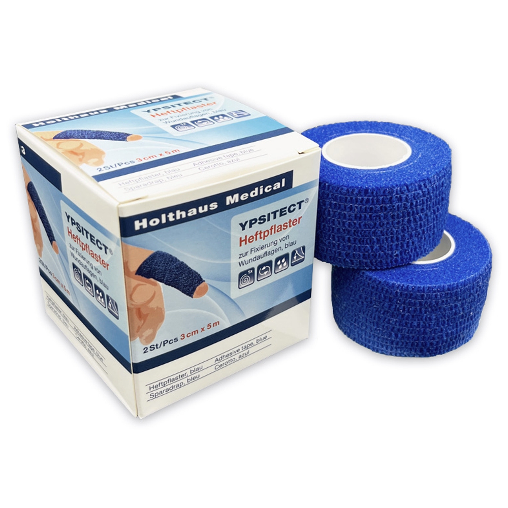 Heftpflaster zur Fixierung von Wundauflagen. 2 Stück in Faltschachtel verpackt. Selbsthaftend, abreißbar, elastisch, rutschfest, wasserfest, ölabweisend, atmungsaktiv, Farbe: Blau. Jede Rolle 3 cm x 5 m.