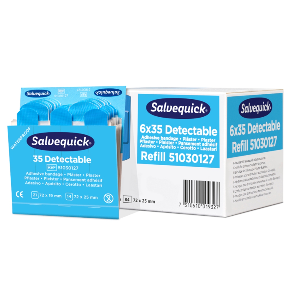 Salvequick Pflaster und Pflasterspender sind ein komplettes und leicht anzuwendendes System. Die Pflaster sind immer am Platz, fertig zur Anwendung. Die Refills sind in den Spendern arretiert, um Schwund zu vermeiden. Die Spender werden schnell und einfach mit einem Spezialschlüssel nachgefüllt. Salvequik Blue Detectable Pflaster sind besonders für die Verwendung im Lebensmittelbereich vorgesehen. Die Pflaster sind detektierbar und werden von den meisten Metalldetektoren nachgewiesen. Dank der blauen Farbe sind sie leicht visuell festzustellen. 6 Einsätze zu je 35 Pflaster, 21 St. 72 x 19 mm und 14 St. 72 x 25 mm.