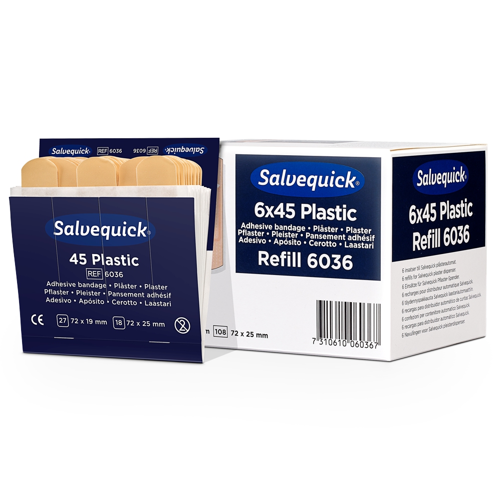 Salvequick Pflaster und Pflasterspender sind ein komplettes und leicht anzuwendendes System. Die Pflaster sind immer am Platz, fertig zur Anwendung. Die Refills sind in den Spendern arretiert, um Schwund zu vermeiden. Die Spender werden schnell und einfach mit einem Spezialschlüssel nachgefüllt. Salvequick wasserabweisende Pflaster sind elastische Pflaster von hoher Qualität. Die Pflaster sind allergiegetestet. Sie können leicht appliziert werden und sind einfach anzuwenden. 6 Einsätze zu je 45 Pflaster, 27 St. 72 x 19 mm und 18 St. 72 x 25 mm.
