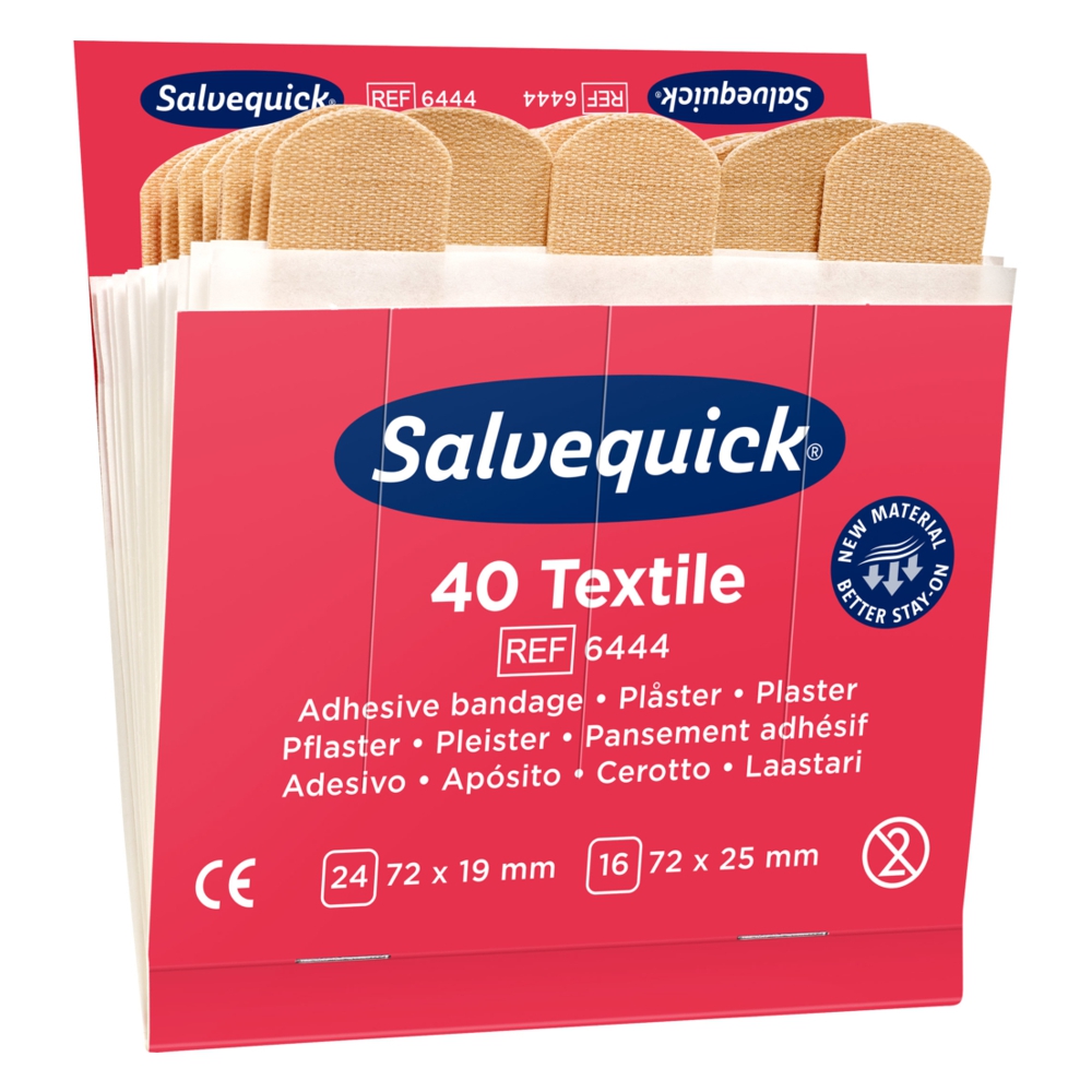 Salvequick Pflaster und Pflasterspender sind ein komplettes und leicht anzuwendendes System. Die Pflaster sind immer am Platz, fertig zur Anwendung. Die Refills sind in den Spendern arretiert, um Schwund zu vermeiden. Die Spender werden schnell und einfach mit einem Spezialschlüssel nachgefüllt. Salvequick Textilpflaster sind elastische Pflaster von hoher Qualität. Die Pflaster sind allergiegetestet. Sie können leicht appliziert werden und sind einfach anzuwenden. Einsatz enthält 40 Pflaster, 24 St. 72 x 19 mm und 16 St. 72 x 25 mm.
