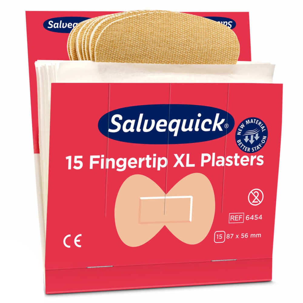 Salvequick Pflaster und Pflasterspender sind ein komplettes und leicht anzuwendendes System. Die Pflaster sind immer am Platz, fertig zur Anwendung. Die Refills sind in den Spendern arretiert, um Schwund zu vermeiden. Die Spender werden schnell und einfach mit einem Spezialschlüssel nachgefüllt. Fingerspitzen-Pflaster sind geschmeidige Textilpflaster für Fingerwunden. Die Pflaster sind allergiegetestet. Sie lassen sich leicht applizieren, sind flexibel und einfach anzuwenden. Einsatz enthält 15 Pflaster, 87 x 58 (23) mm.