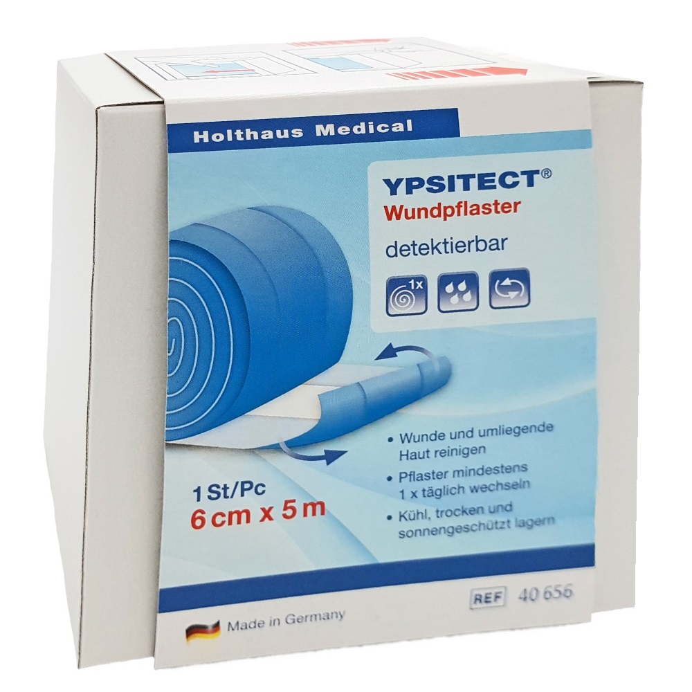 Aus wasser abweisender und Öl beständiger blauer PU-Folie, welche gleichzeitig elastisch ist mit latexfreiem Polyacrylatkleber. Detektierbar durch Aluminiumstreifen unter der Wundauflage. Ypsitect Wundpflaster 6 cm x 5 m, blau, detectable.