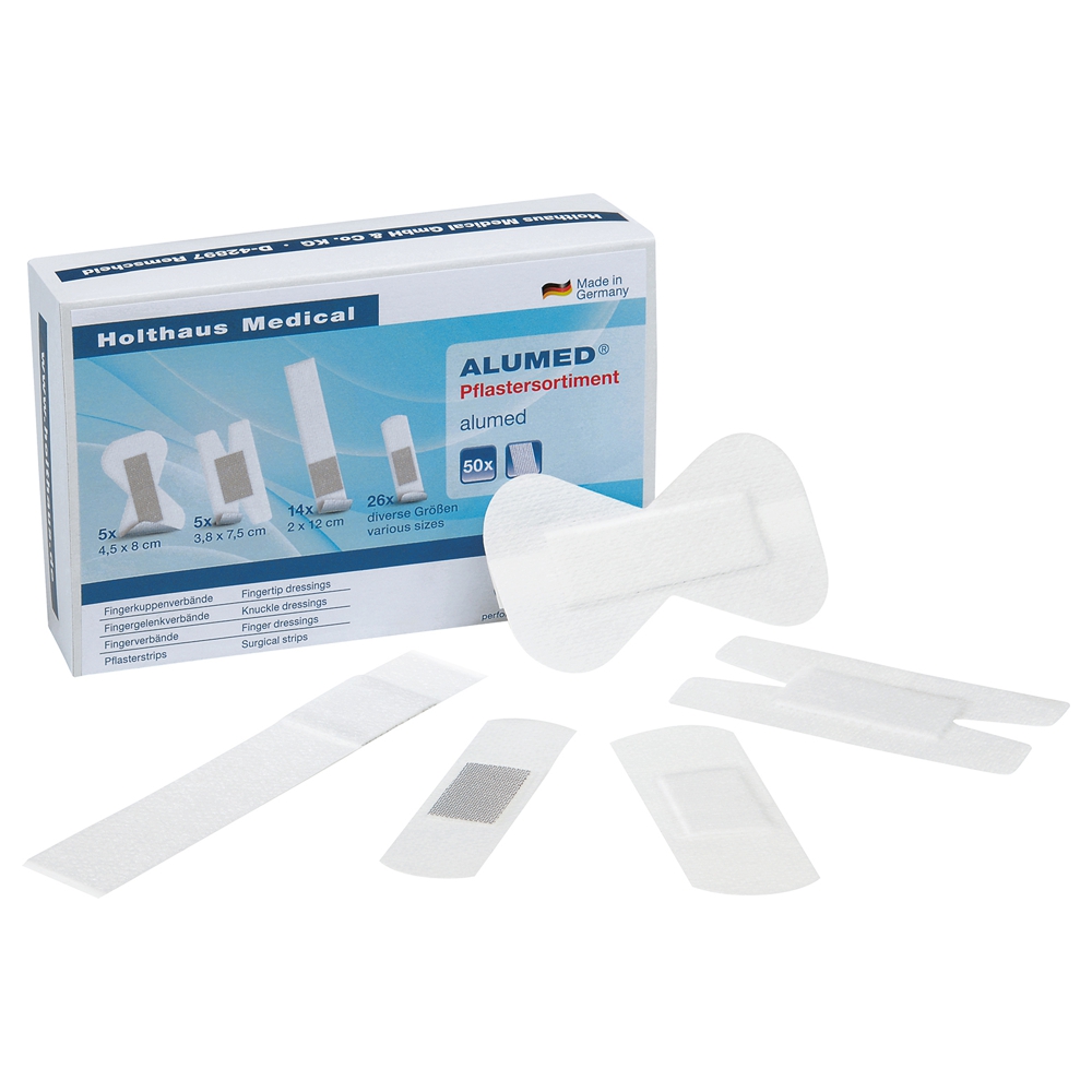 Aus elastischem, weißem Vlies mit Aluminium beschichteter Wundauflage und latexfreiem Polyacrylatkleber. 50-teiliges Pflastersortiment bestehend aus: