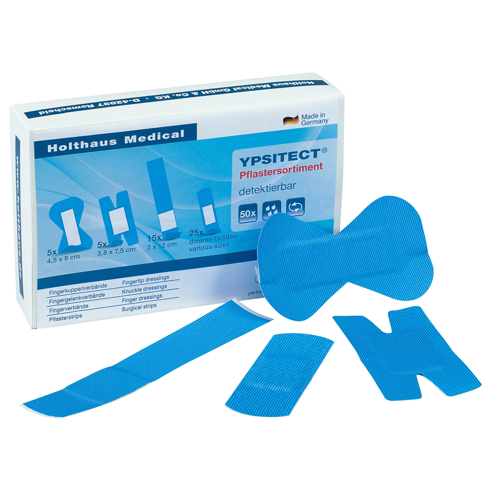 Aus Wasser abweisender und Öl beständiger blauer PU-Folie, welche gleichzeitig elastisch ist. Mit latexfreiem Polyacrylatkleber, detektierbar durch Aluminiumstreifen unter der Wundauflage. 50-teiliges Wundpflastersortiment bestehend aus: