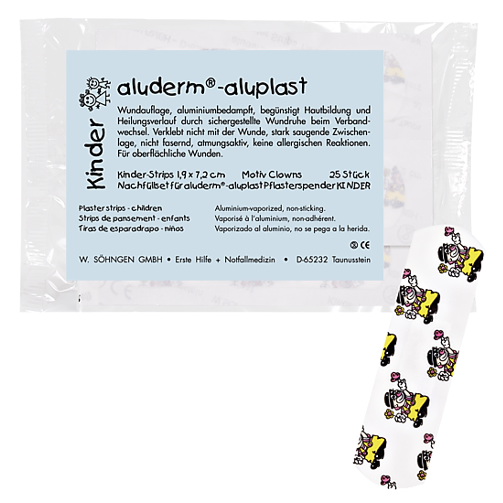 aluderm-aluplast Nachfüllsets für Pflasterspender Kinder. Set Strips 7,2 x 1,9 cm Clown 25 Pflaster.aluderm-aluplast - das Wundpflaster mit aluderm. aluderm-aluplast ist das besondere Wundverbandpflaster mit aluminiumbedampfter aluderm-Wundauflage und Saugvlies. aluderm verklebt nicht mit der Wunde, fasert nicht, ist stark saugend, kann bei der Hautbildung und Heilung helfen, ist atmungsaktiv. aluderm-aluplast elastisch: Trägermaterial hochelastisches Polyestervlies, weiß, besonders hautfreundlich, gut luftdurchlässig, wasserabweisend. Der Polyacrylatkleber wird durch Körperwärme zusätzlich aktiviert. Besonders anschmiegsam, passt sich allen Bewegungen an, hypoallergen, reizfrei. Auch für Personen mit empfindlicher Haut oder Pflasterallergien besonders geeignet.