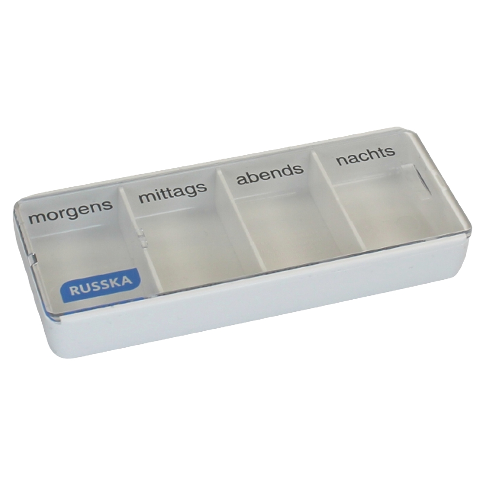 Tablettendose Medikamenten-Kasette, bruchsicher, keine Verpackungen der Medikamente mehr zu öffnen, handfreundlich, mit 4 Fächern. Ca 11 x 4.5 x 1.6 cm. Auch für größere Tabletten geeignet.