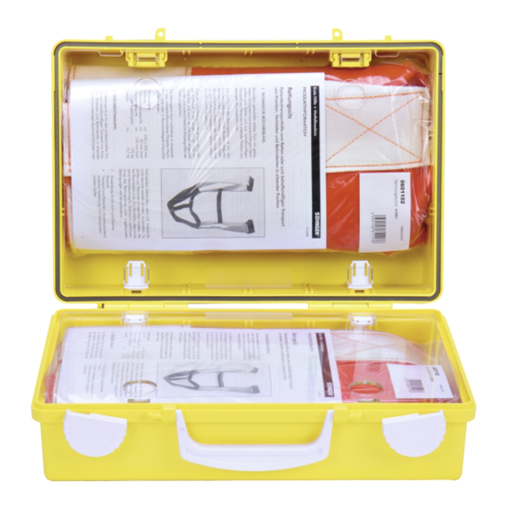 Erste-Hilfe-Koffer mit zwei SÖHNGEN Rettungssitzen KOMBI. Zentrale, leicht zugängliche Aufbewahrung, ermöglicht bei Notfallsituationen in beengten Raumverhältnissen oder brennenden Gebäuden eine schnelle Evakuierung gefährdeter Personen. Erste-Hilfe-Koffer Modell SN-CD: