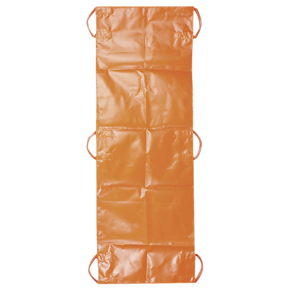 Aktuelle Ausführung nach DIN EN 1865, aufwendig verarbeitet, Tragegriffe mit Kunststoffschlauch verstärkt. An den Längsseiten befinden sich je drei Tragegriffe. - Material: Planengewebe hochfest, orange, oberflächenversiegelt, Flächengewicht 650 g/m2, LKW-Planenqualität, temperaturbeständig, reißfest, schwerentflammbar, schmutzabweisend, pflegeleicht, nach DIN-EN 1865. Maße: 2.000 x 700 mm.