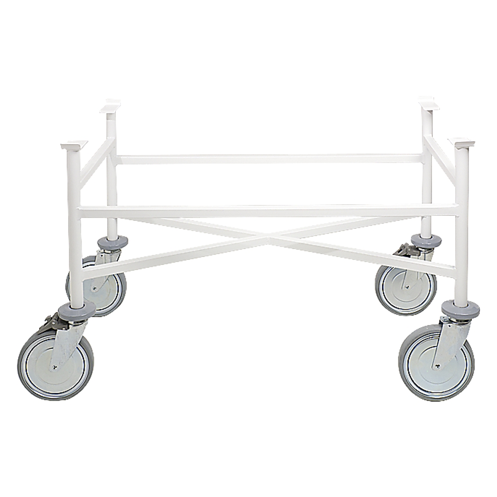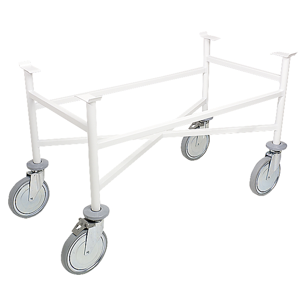 Fahrgestell für Krankentragen - starr. Abmessungen fahrbereit 1.060 x 570 x 700 mm. Nahtloses Stahlrohr, elektrostatisch weiß pulverbeschichtet. Vier stabile Auflagebügel, vier Wandabweisrollen Ø 100 mm. Vier kugelgelagerte, gummibereifte Lenkrollen Ø 200 mm, davon zwei Lenkrollen über Kreuz mit feststellbarer Doppelstop-Vorrichtung. Sehr solide und stabil verarbeitet, bequeme Handhabung, leicht zu bewegen, mit richtiger Arbeitshöhe für Patientenbetreuung und Versorgung, für Krankentragen aller Typen geeignet.