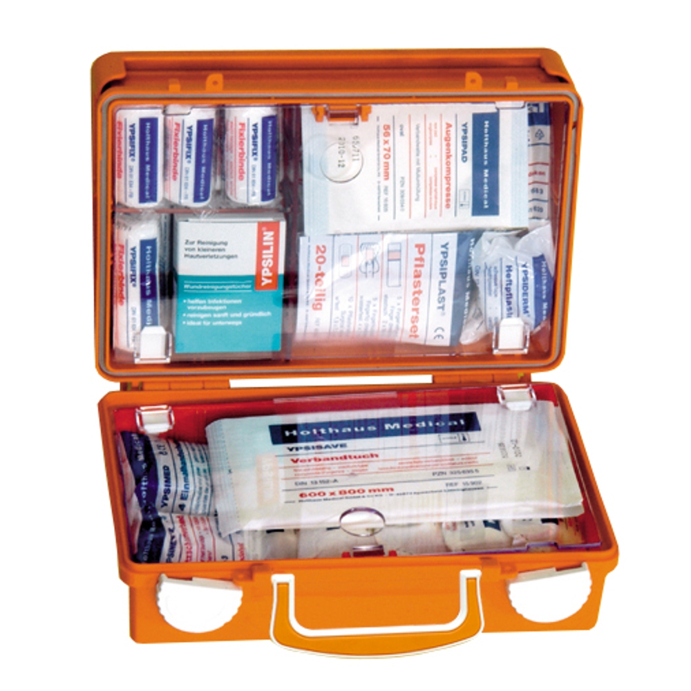 Erste Hilfe Koffer HOLTHAUS Quick mit DIN 13157. Aus hochschlagfestem ABS-Kunststoff mit umlaufender Gummidichtung, leichtgängige Drehverschlüsse und verstärkter Tragegriff, transparente Abdeckplatten zum Schutz der Füllteile variable Inneneinteilung durch die Trennstege, inklusive Wandhalterung mit 90°-Stop-Arretierung, plombierbar inklusive Montagematerial und nachleuchtendem Rettungszeichen.