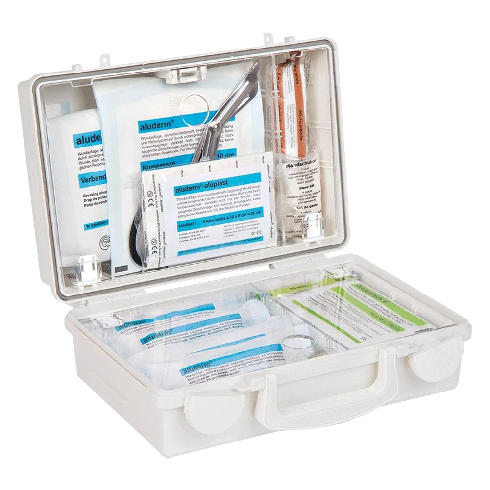 Füllung Norm nach DIN 13157. Der Koffer kann schnell aus der Wandhalterung entnommen und an den Unfallort gebracht werden. Auch in der Wandhalterung zu öffnen. Handliche Grifftasten für problemlose Kofferentnahme. Zwei gleich große Kofferschalen, transparente Abdeckplatten, Inneneinteilung verstellbar. Regeneratfrei, cadmiumfreie Einfärbung, für medizinische Geräte, Arzneimittel und Lebensmittel zugelassen. Formbeständig, schlagfest, temperaturbeständig, spritzwassergeschützt, staubdicht, wartungsfrei. Ausgereifte Technik, hervorragendes Sicherheitsverhalten, keine scharfen Ecken und Kanten, alle Bauteile abgerundet, griffsympathisch, in alle Einzelteile zerlegbar.