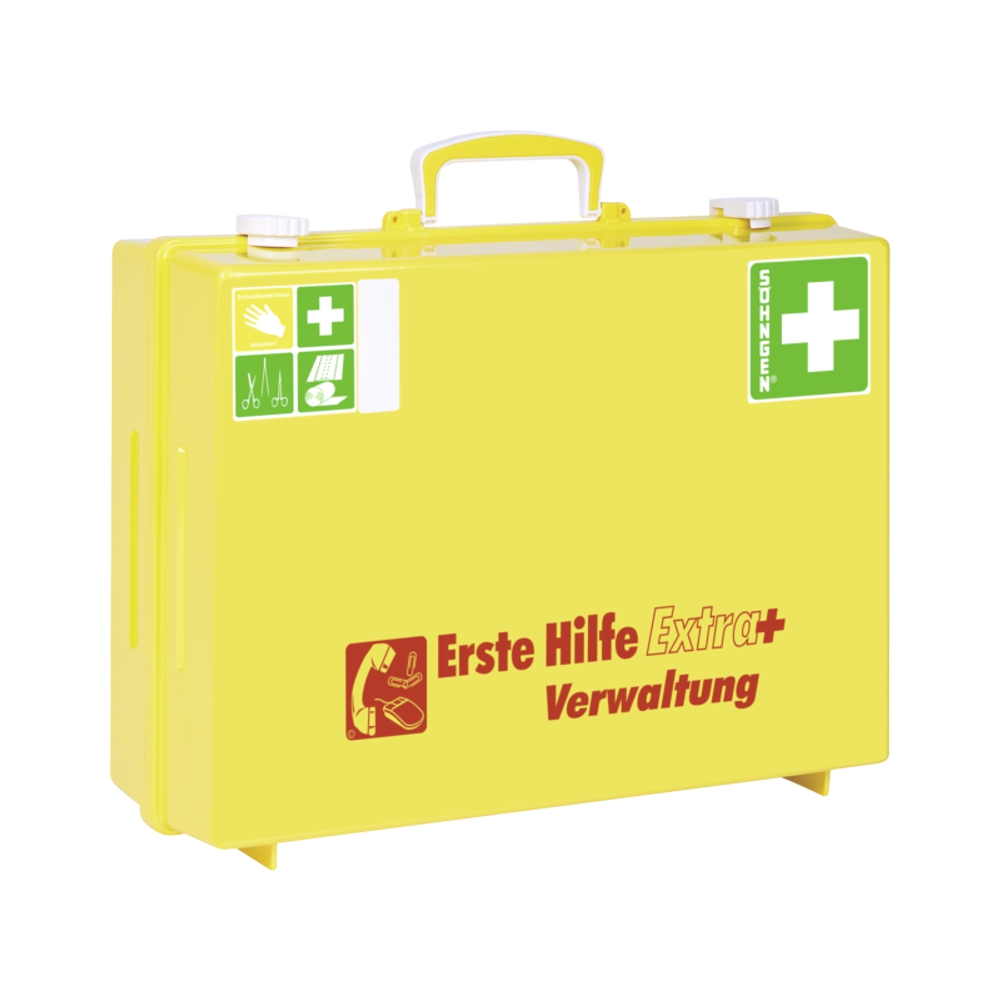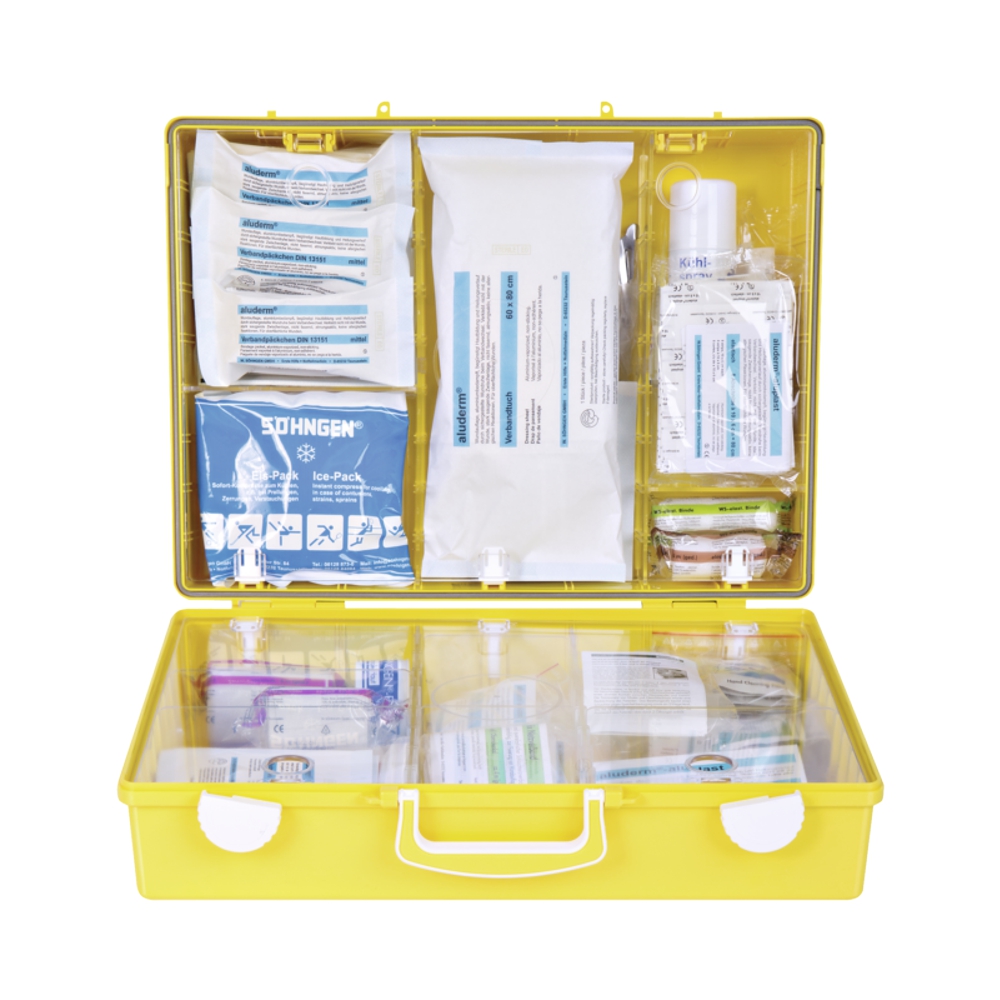 Leuchtgelb in Verbindung mit Signalrot werden neben der bereits fest etablierten Rettungsfarbe orange europaweit die künftigen Farben für viele rettungsdienstliche Einrichtungen und Ambulanzfahrzeuge sein. Die Farbkombination ergibt stets einen auffallenden Kontrast vor hellem und vor dunklem Hintergrund, schon von weitem wird eine Signalwirkung und ein hoher Erkennungswert erzielt. Reflektionsstreifen erhöhen die Erkennbarkeit im Dunkeln oder bei Stromausfall. Inhalte: Die Füllungen der Serie Erste Hilfe Extra basieren auf der Norm DIN 13157 für Betriebsverbandkasten. Die Modelle Extra+ gehen über diese DIN-Norm weit hinaus und enthalten zusätzlich wertvolle Ergänzungen und Erweiterungen, die für eine qualifizierte Erste Hilfe empfehlenswert sind. Ganz besonderer Wert wurde auf die hohe Qualität der Verbandstoffe gelegt. SÖHNGEN Markenverbandstoffe bürgen für bestmögliche Versorgung.