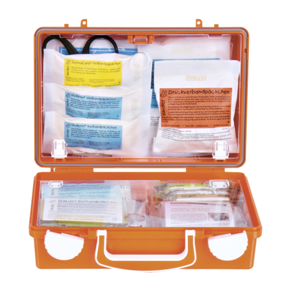 Erste-Hilfe-Koffer mit Spezialfüllung Schule für Grundschüler ab 6 Jahren. Speziell entwickelte Verbandstoffe in kindgerechten Größen und Abmessungen unter Berücksichtigung der Unfallarten, wie sie im Klassenzimmer oder auf dem Schulgelände häufig vorkommen. Koffer QUICK-CD: