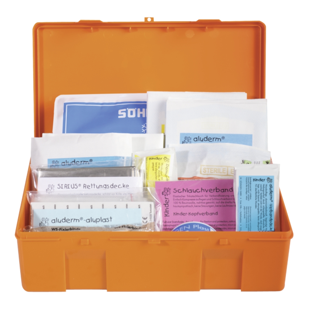 Mit Spezialfüllung Schule für Grundschüler ab 6 Jahren. Verbandkasten aus hochschlagzähem Kunststoff in orange: