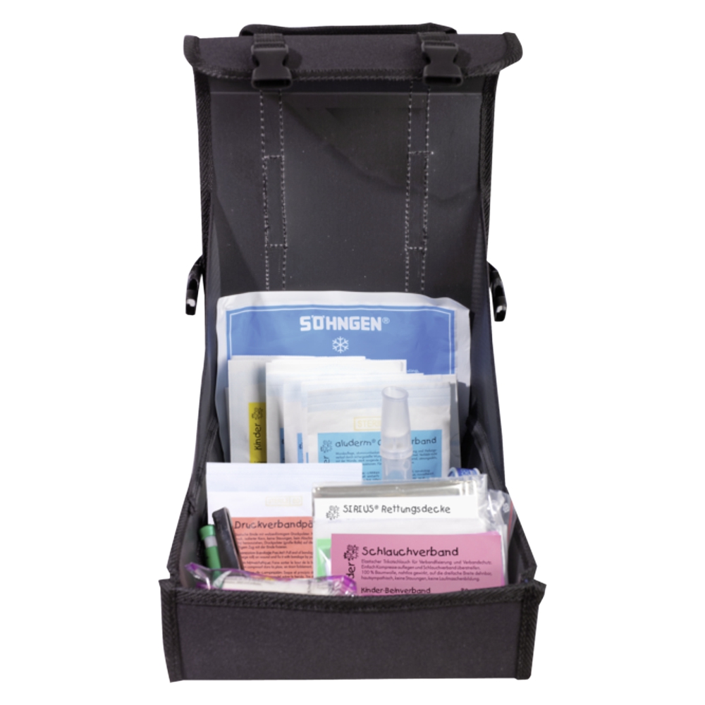 Erste-Hilfe-Tasche - SCHULAUSFLUG. Maße: 225 x 260 x 100 mm. Nylongewebe / Kunststoff, schwarz, pflegeleicht, verrottungssicher, Kanten gesäumt und verstärkt. Abnehmbarer, verstellbarer Schultergurt mit Karabinerhaken, Tragegriff, Clipverschlüssen vorn und seitlich, verstellbarer Inneneinteilung. Mit Füllung SCHULAUSFLUG, speziell orientiert an Unfallrisiken, mit denen bei Schulausflügen und Wanderungen besonders gerechnet werden muss.