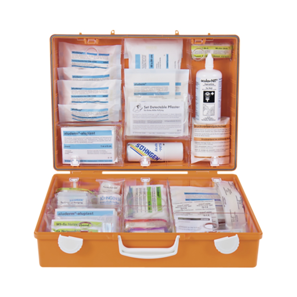 Erste-Hilfe-Koffer SPEZIAL Landwirtschaft & Forsten für landwirtschaftliche Produktionsstätten, Viehzucht- und -mastbetriebe, Hühnerfarmen, Acker- und Gartenbau-, Winzer- und Forstbetriebe. Unterschiedliche Gefährdungen erfordern unterschiedliche Ausstattungen. In dieser Spezial-Serie wurden auf Basis der aktuellen DIN-Normen für Betriebsverbandkästen die Inhalte individuell berufsrisikobezogen erweitert und werden somit den unterschiedlichen Anforderungen in Industrie, Handel und Dienstleistung gerecht. Der Erste-Hilfe-Koffer SPEZIAL Baustelle enthält daher ganz andere Inhaltserweiterungen als der Erste-Hilfe-Koffer SPEZIAL Verwaltung. Inhalt: Basis-Ausstattung Erste-Hilfe-Material entsprechend der aktuellen Norm nach DIN 13157 für Betriebsverbandkästen plus eine individuell berufsrisikobezogene Erweiterung.