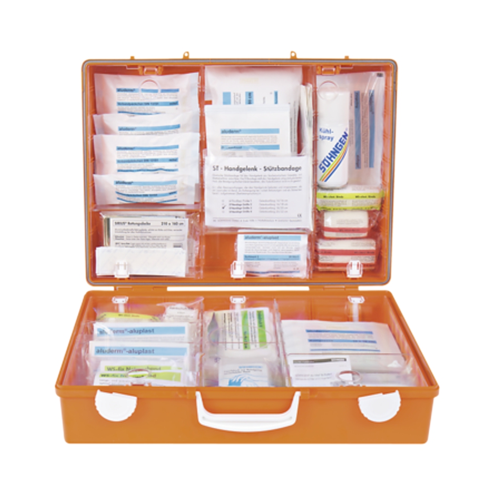 Erste-Hilfe-Koffer SPEZIAL Verwaltung für Arbeitsstätten mit überwiegender Bürotätigkeit, Versicherungen, Verwaltungsabteilungen von Industrie, Handel und Gewerbe. Unterschiedliche Gefährdungen erfordern unterschiedliche Ausstattungen. In dieser Spezial-Serie wurden auf Basis der aktuellen DIN-Normen für Betriebsverbandkästen die Inhalte individuell berufsrisikobezogen erweitert und werden somit den unterschiedlichen Anforderungen in Industrie, Handel und Dienstleistung gerecht. Der Erste-Hilfe-Koffer SPEZIAL Baustelle enthält daher ganz andere Inhaltserweiterungen als der Erste-Hilfe-Koffer SPEZIAL Verwaltung. Inhalt: Basis-Ausstattung Erste-Hilfe-Material entsprechend der aktuellen Norm nach DIN 13157 für Betriebsverbandkästen plus eine individuell berufsrisikobezogene Erweiterung.