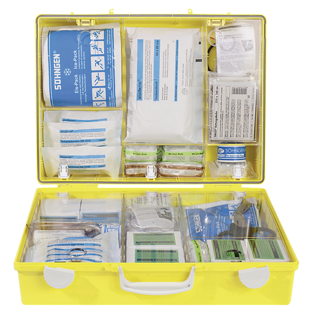 Erste-Hilfe-Koffer für den stationären und mobilen Einsatz, ideal für Sportvereine, Sporthallen und Sportanlagen geeignet.Inhalt: DIN 13157 plus Erweiterung, u.a. mit Kühlspray, zusätzliche Kältekissen, Kohäsivbinden, Tape, aluderm Kompressen und Quickverbände, aluderm-aluplast Wundpflaster, WS-Binden, SIRIUS Rettungsdecke, SÖHNGEN-Plast Heftpflaster, Wundreinigungstücher, Blasenpflaster, Klammerpflaster, Beatmungstuch. Erste-Hilfe-Koffer Modell MT-CD: