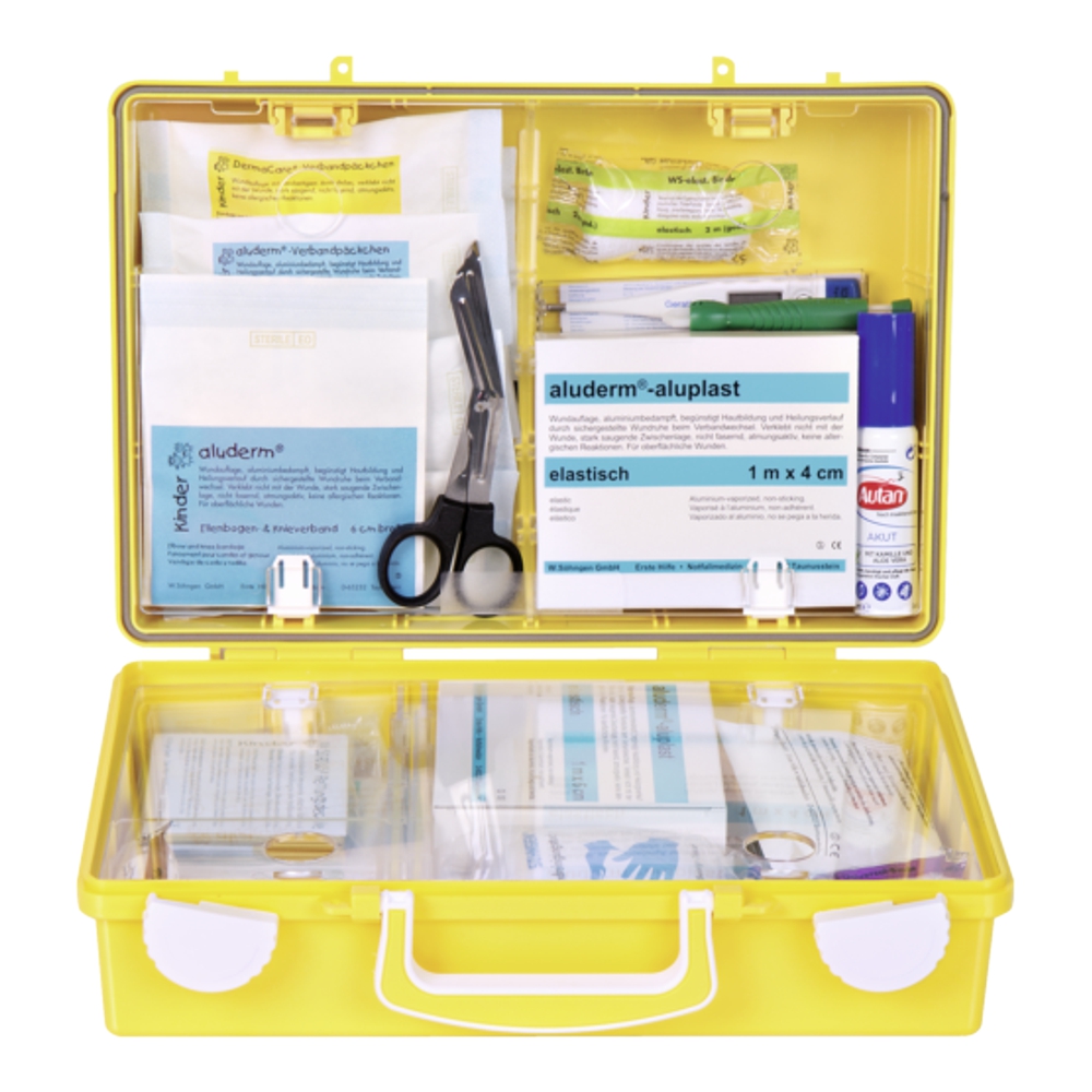 Sonderausstattung Erste-Hilfe-Versorgung in Betreuungseinrichtungen für Kinder unter 3 Jahren. Durch den Anspruch auf einen Betreuungsplatz für Kinder unter 3 Jahren ist damit auch gleichzeitig eine Pflicht zur Bereithaltung von Erste-Hilfe-Material verbunden. Als Erste-Hilfe-Inhalt der SÖHNGEN Serie Frühkindliche Betreuung wurden nur Produkte ausgewählt, die besondere Eigenschaften besitzen - deshalb sind auch Spezialverbände in kleinkindgerechten Abmessungen enthalten, die durch ihre hohe Anwenderfreundlichkeit eine sehr einfache und schnelle Wundversorgung gewährleisten. Erste-Hilfe-Koffer SN-CD: