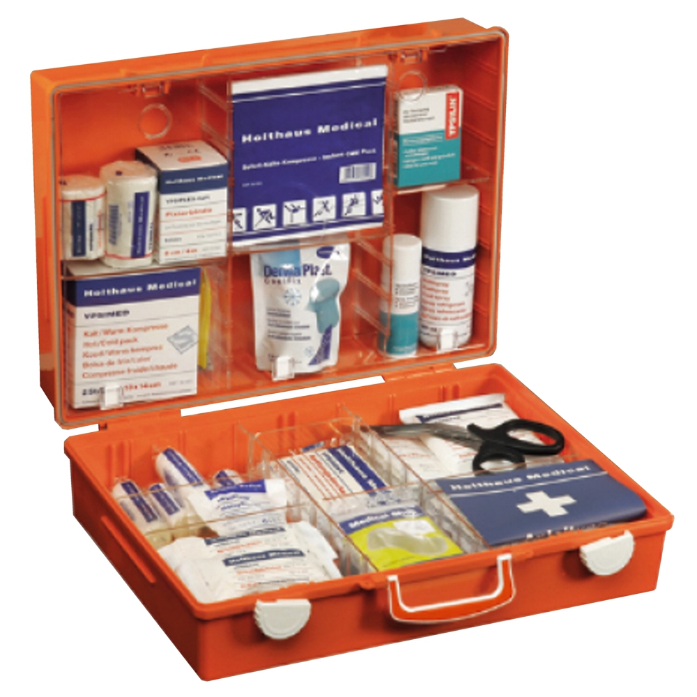 Hochwertiger Koffer aus ABS mit bedarfsgerechter Füllung für den Sport-Bereich. Inklusive Kältekompressen, Kühlspray, Kühlbinde und Universalschiene sowie Beatmungstuch, Blasenpflaster und div. Verbandstoffe zur Ersten Hilfe, 40 x 30 x 15 cm, gefüllt, orange.