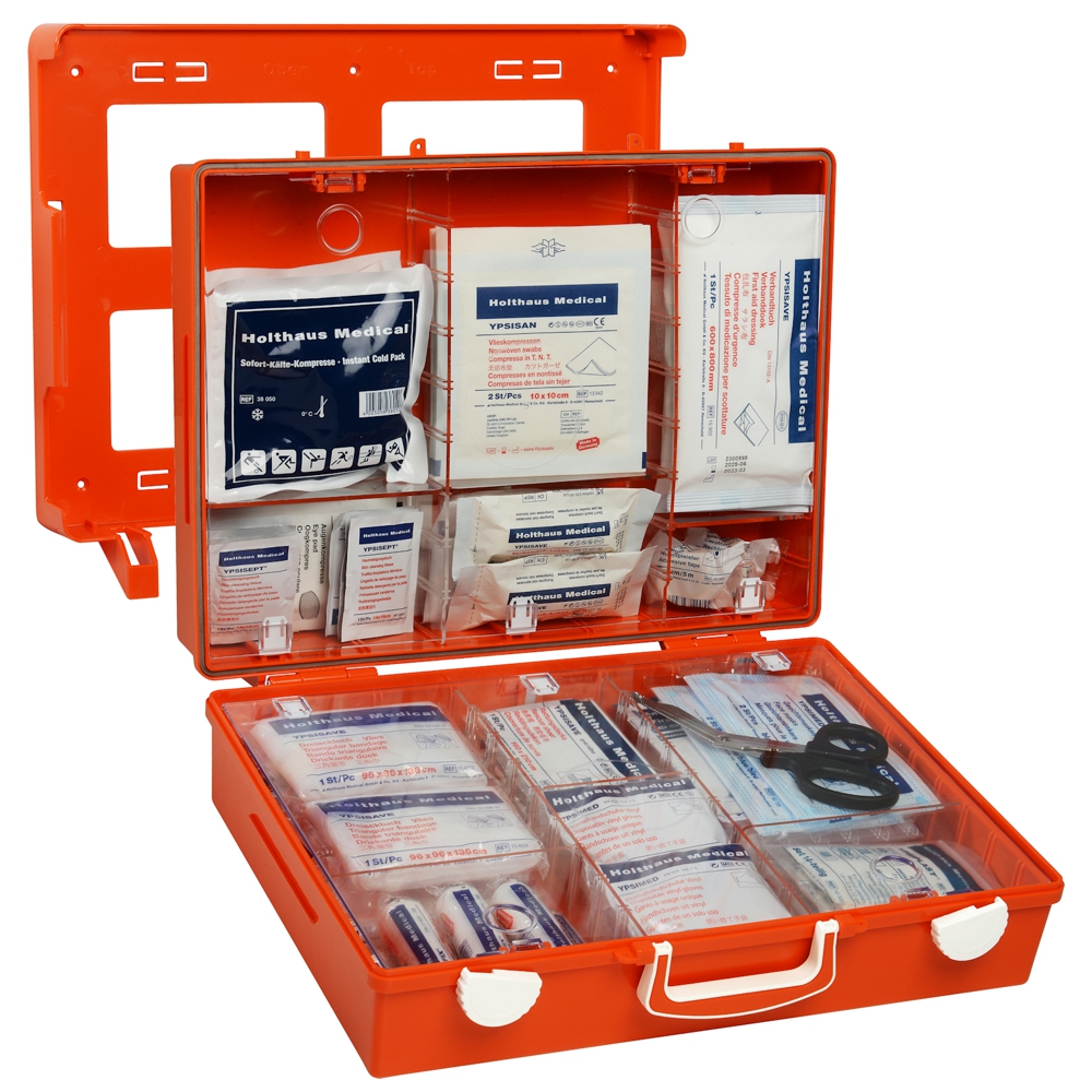 Erste Hilfe Koffer HOLTHAUS MULTI mit Füllung ÖNORM Z 1020:2025 Aus hochschlagfestem ABS-Kunststoff mit umlaufender Gummidichtung, leichtgängige Drehverschlüsse und verstärkter Tragegriff, transparente Abdeckplatten zum Schutz der Füllteile variable Inneneinteilung durch die Trennstege, inklusive Wandhalterung mit 90°-Stop-Arretierung, plombierbar inklusive Montagematerial und nachleuchtendem Rettungszeichen.
