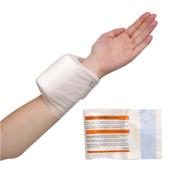 Der absolut unkomplizierte, gebrauchsfertige SÖHNGEN Druckverband bei allen Verletzungen mit strömender Blutung. Das Spezial-Druckverbandpäckchen ersetzt jeden herkömmlichen Druckverband, es verrutscht oder verschiebt sich nicht und ist auch von Ungeübten schnell und fehlerfrei anzulegen. Das Spezial-Druckverbandpäckchen hat ein Druckpolster mit festem, isoliertem Kern und sehr starken Sauglagen, ein Durchbluten ist nicht möglich. Die angenähte elastische WS-Fixierbinde sitzt außerordentlich sicher und rutschfest, ohne die Blutzirkulation zu behindern. Das Spezial-Druckverbandpäckchen bewirkt einen einwandfreien Blutungsstillstand, es gibt keine Stauungen und kein Abschnüren. Eine sichere, zuverlässige und erfolgreiche Methode ohne aufwendige Vorbereitung. Farbcode orange, EO-sterilisiert, einzeln in Peelpackung.